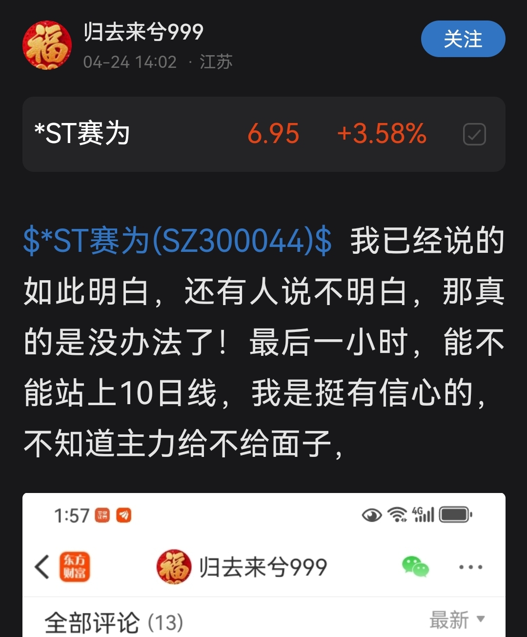 $*ST赛为(SZ300044)$ 爱装,还屡次被打脸,我要是你,早就扎个没人的地方斯了得了
