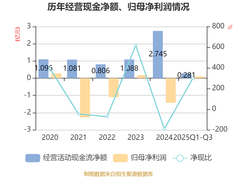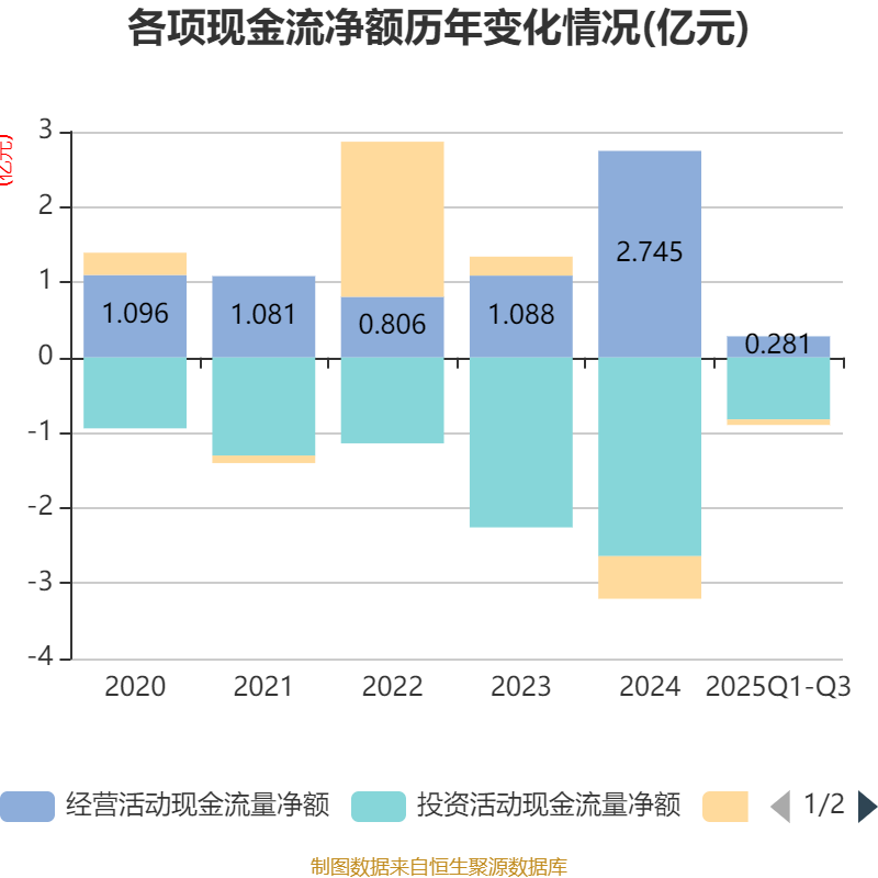 2025年前三季度,公司经营活动现金流净额为2808.07万元,同比下降56.82%;筹资活动现金流净额-737.52万元,同比增加4006.61万元;投资活动现金流净额-8227.27万元,上年同期为-8487.68万元。