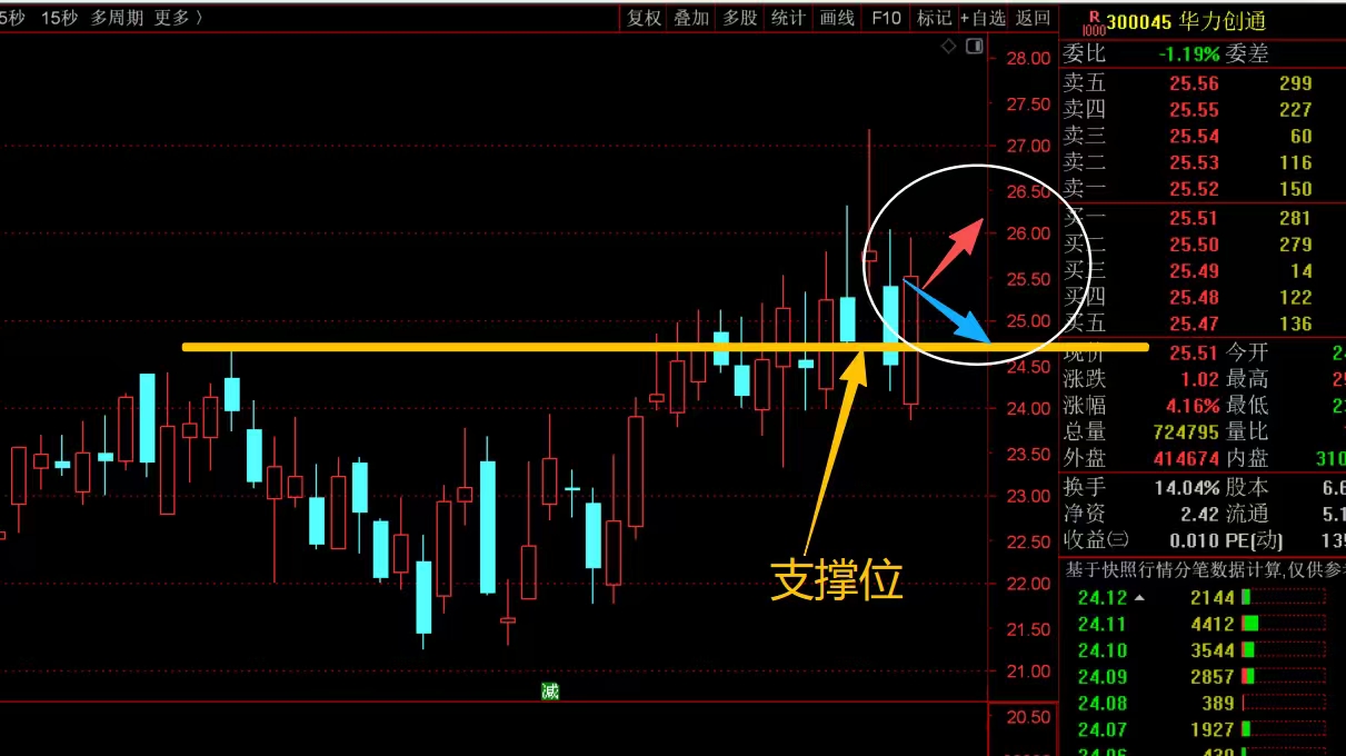 $华力创通(SZ300045)$ 近期走势比较折腾,上下震荡频率比较高,但是整体没有太大的方向性,只能说略微向上,不算差,今天中阳反包昨天的阴线,效果还不错,接下来就看能否继续震荡拉高,如果回落就看脚底横线位置的支撑,能稳住就没问题,但有效跌破就要注意短线的回落风险了,控制仓位应对。#炒股日记# #强势机会#