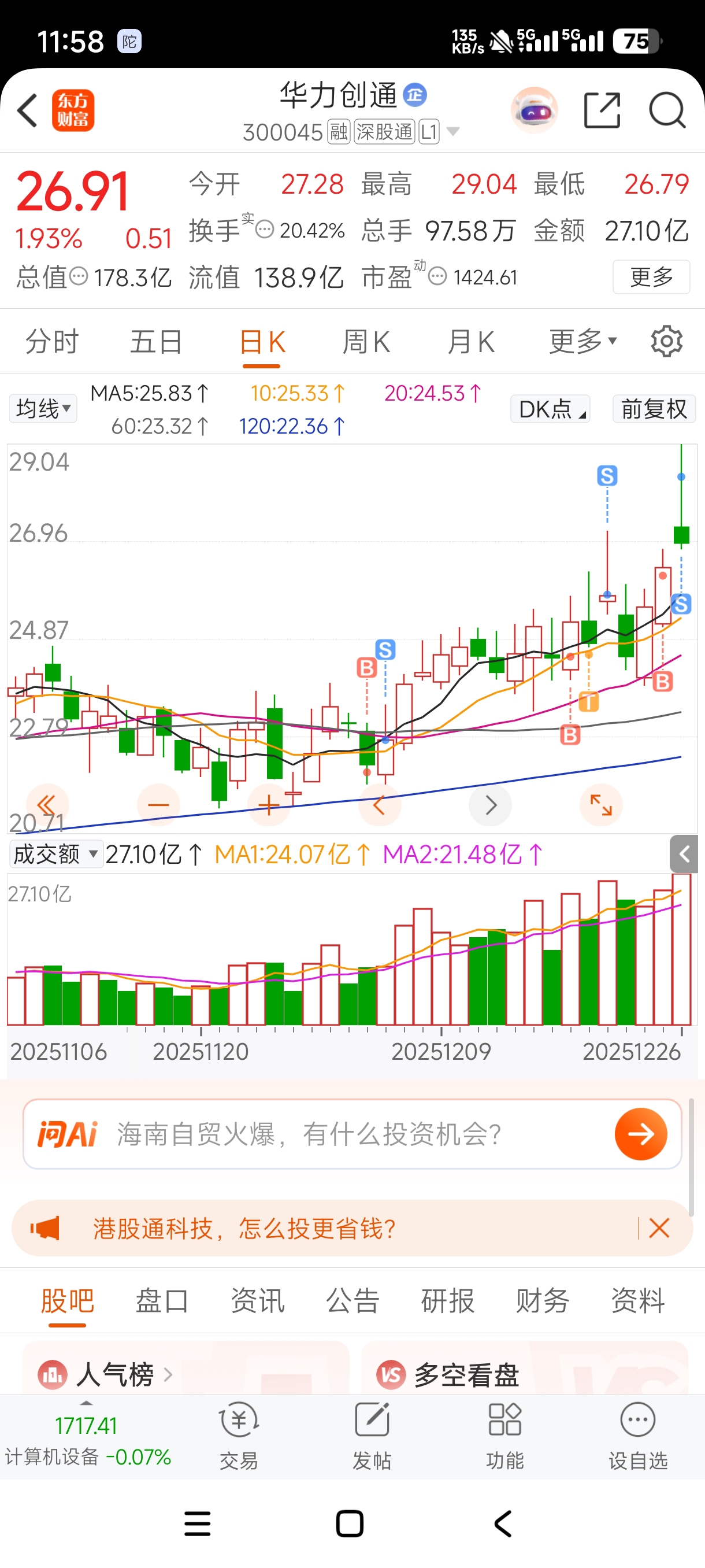 $华力创通(SZ300045)$ 幸亏跑的早,不过回调到20日线还能有一波行情