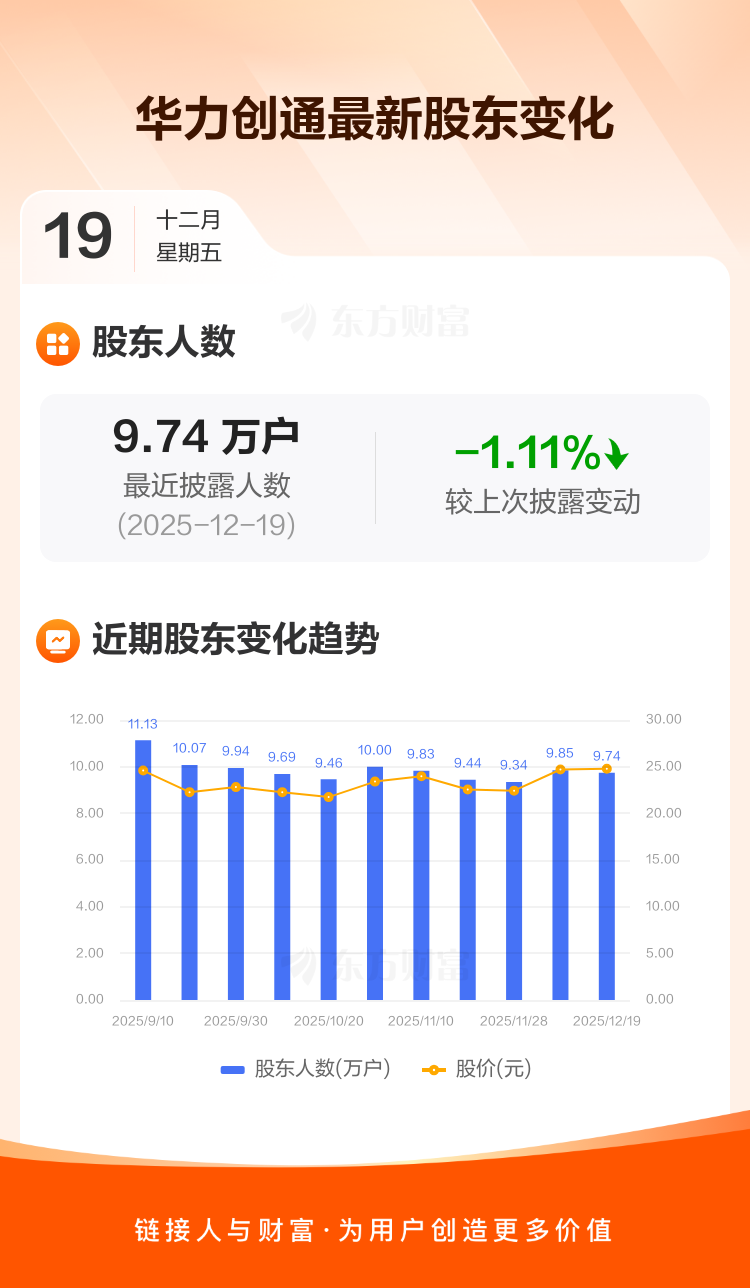 华力创通:截至12月19日最新股东户数9.74万户,较上期减少1.11%
