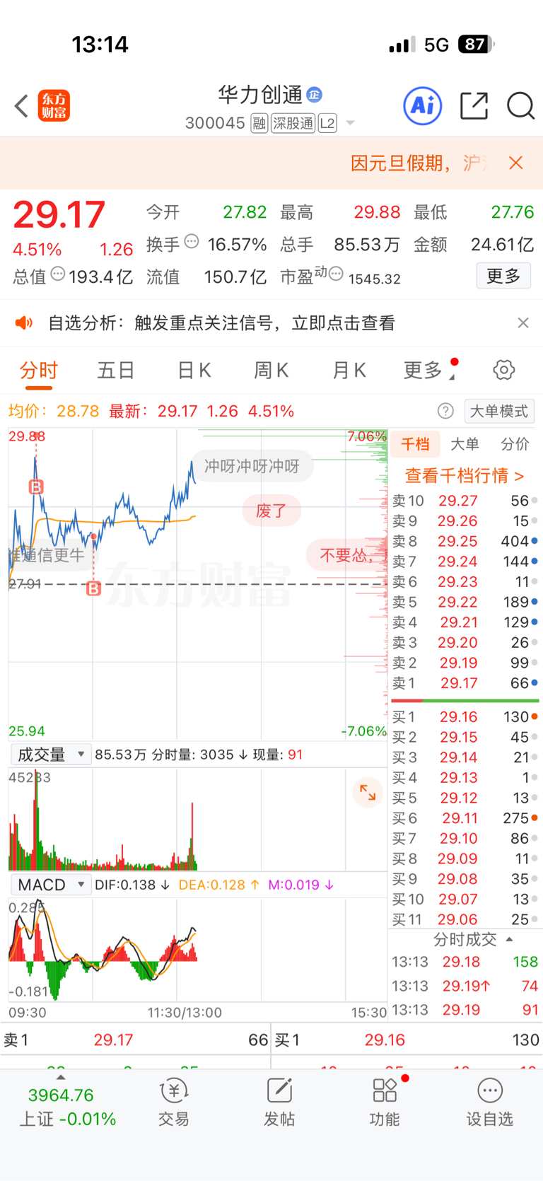 $华力创通(SZ300045)$ 早上太冲动了,以为一鼓作气,结果站岗!