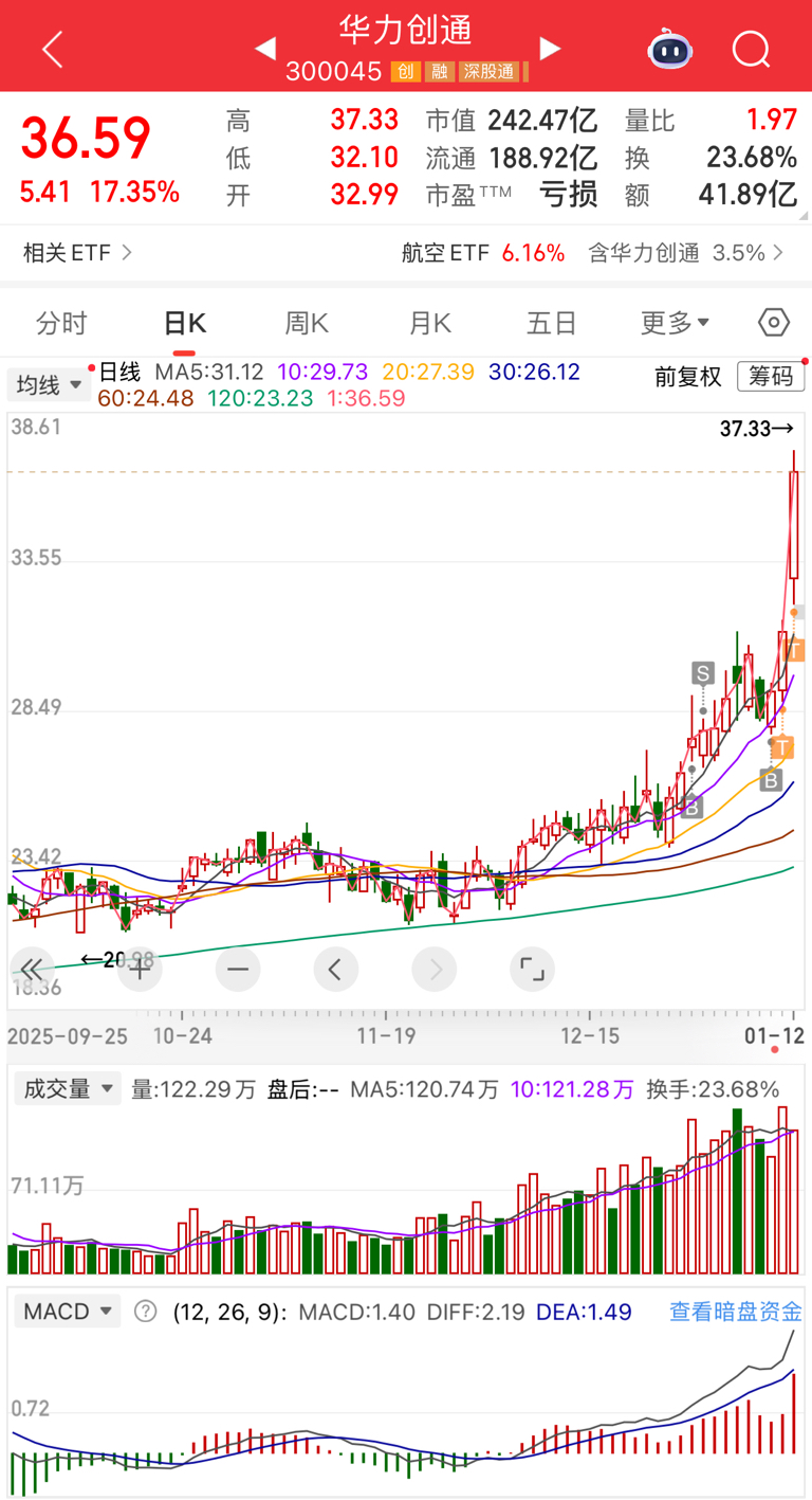 $华力创通(SZ300045)$ 上周四再次建仓华力,今天中午收盘前减了,指数连续上涨这么多天,今天放量加速,有两种可能:一个是赶顶,另一个是发起总攻,猜不准,就先分批减一点,如果冲高回落,就继续减,如果接着高歌猛进也不亏