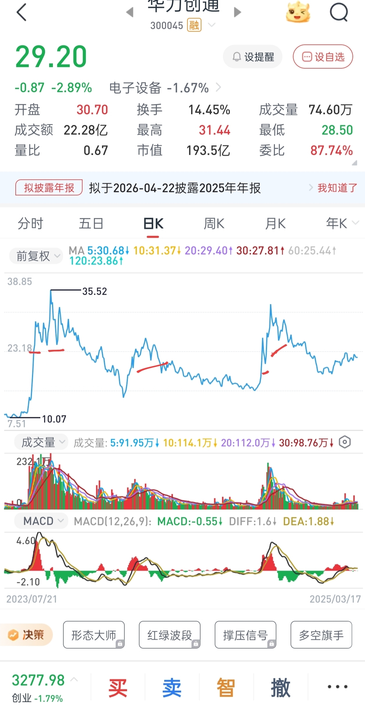 把华力创通走势图贴出来,可以发现一个现象: 每次在高位急跌下来,不久后都会有不错的反弹,甚至反转。这次也不会例外。