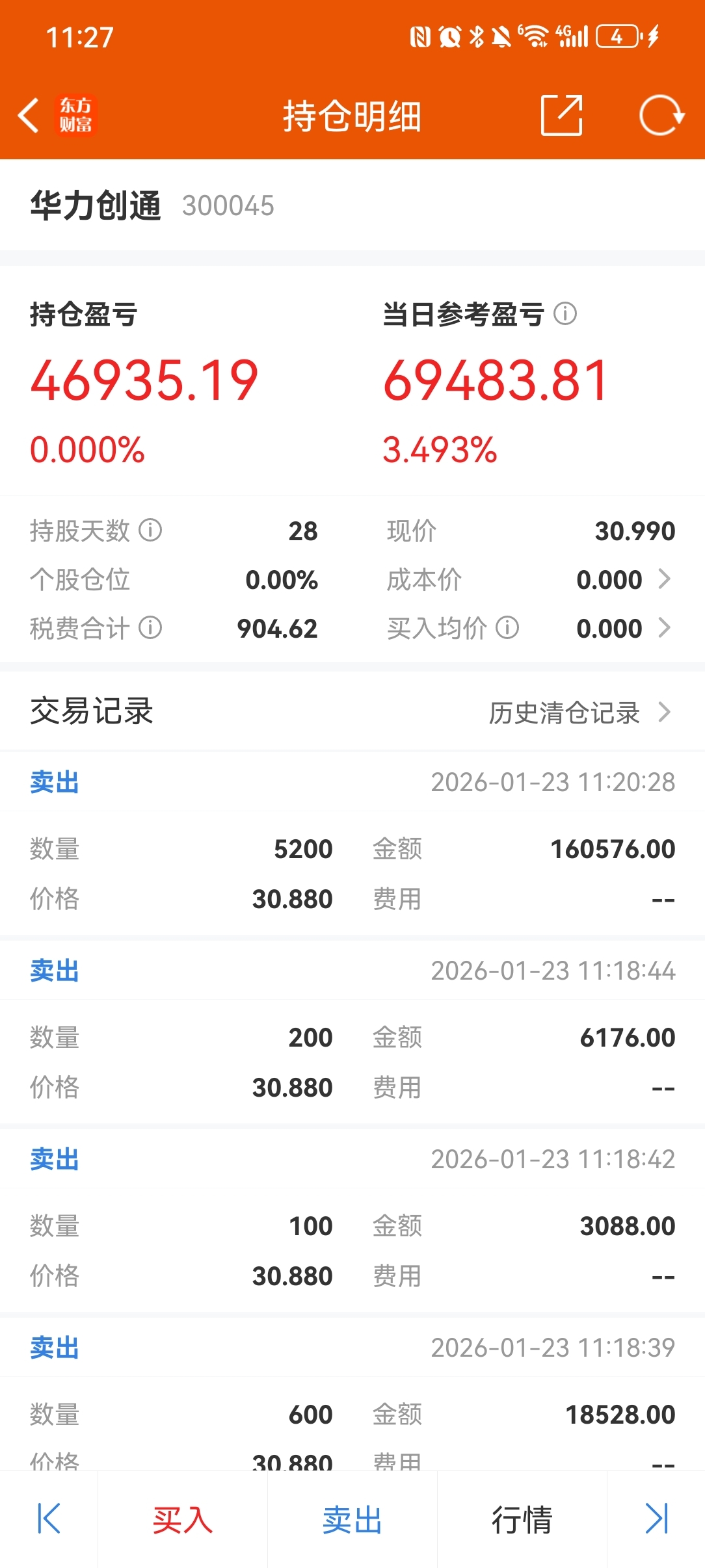 $华力创通(SZ300045)$ 12月26日开盘买进华力创通,1月12号迎来唯一的一个涨停板,名下3个账户都持有华力创通,盈利最高点单支票接近100万元,13号开盘卖出,挂高了,一路大跌,途中加仓,今天卖出获利不足区区10万元