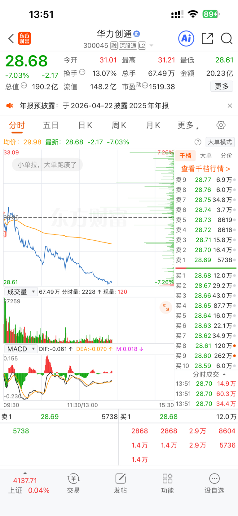 $华力创通(SZ300045)$ 还好买的不多。。。