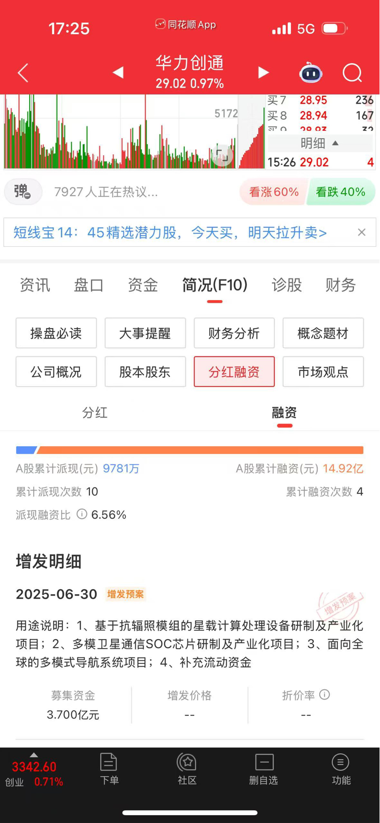 $华力创通(SZ300045)$ 这颗Soc芯片最有竞争力,良率己经达到9 5%以上。看看什么时候这个定增发出来,发出来前估计都会压价。这里守望的话,短期可能会比较难受,但中长期还是看好的