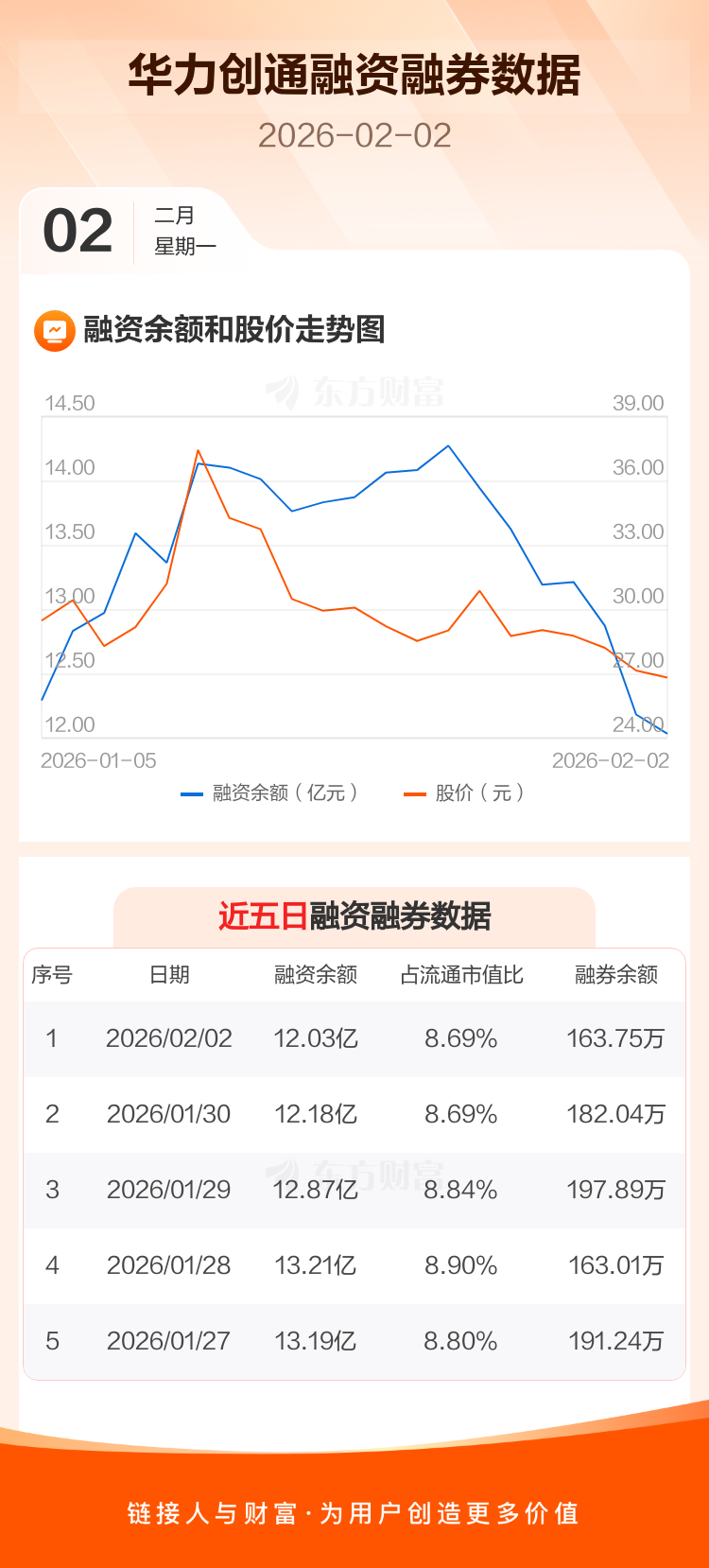 交易所最新数据显示,华力创通于2026年2月2日获融资买入5993.38万元,融资偿还7504.45万元,当日融资净偿还1511.07万元。目前,该股融资余额12.03亿,占流通市值比例为8.69%。