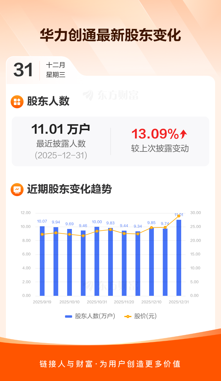 华力创通:截至12月31日最新股东户数11.01万户,较上期增加13.09%