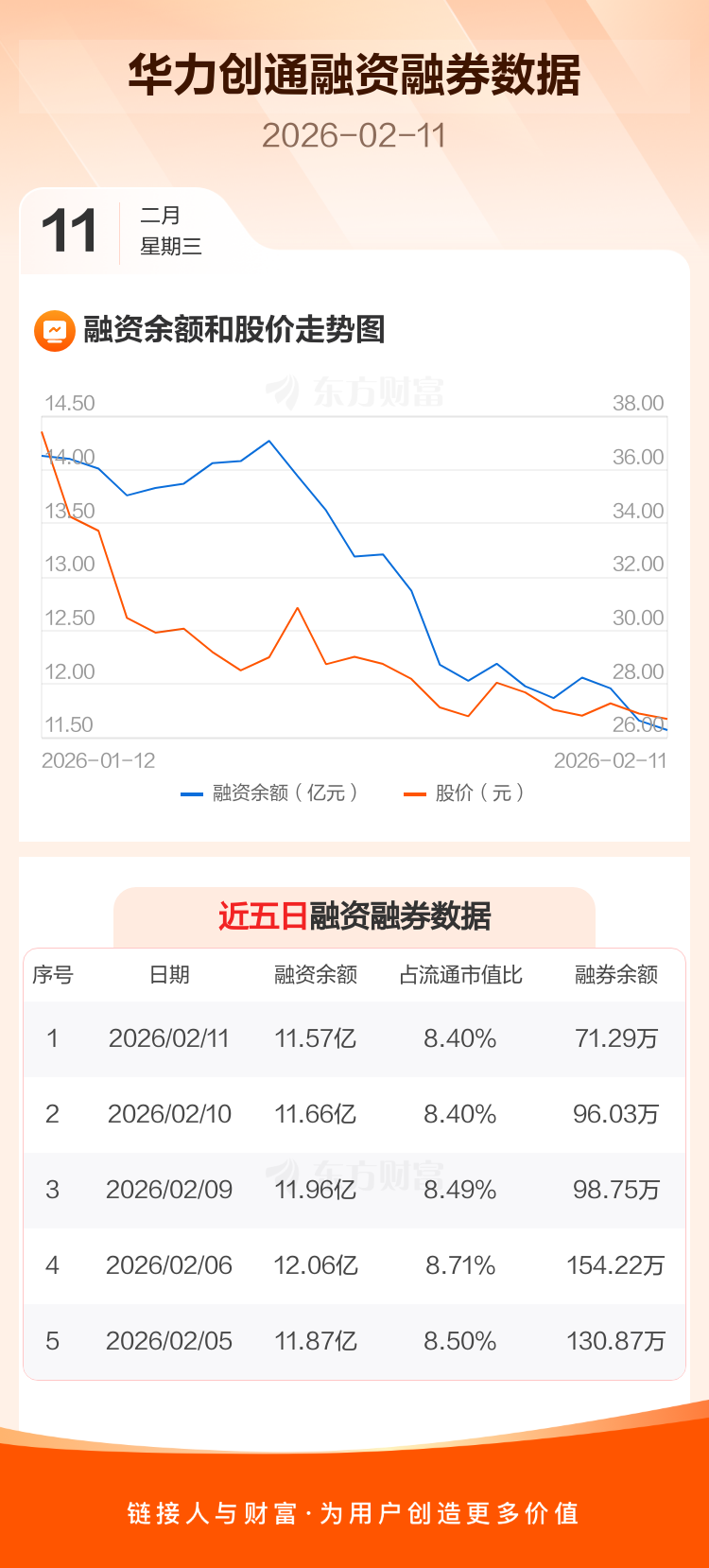 交易所最新数据显示,华力创通于2026年2月11日获融资买入5397.75万元,融资偿还6288.93万元,当日融资净偿还891.17万元。目前,该股融资余额11.57亿,占流通市值比例为8.40%。