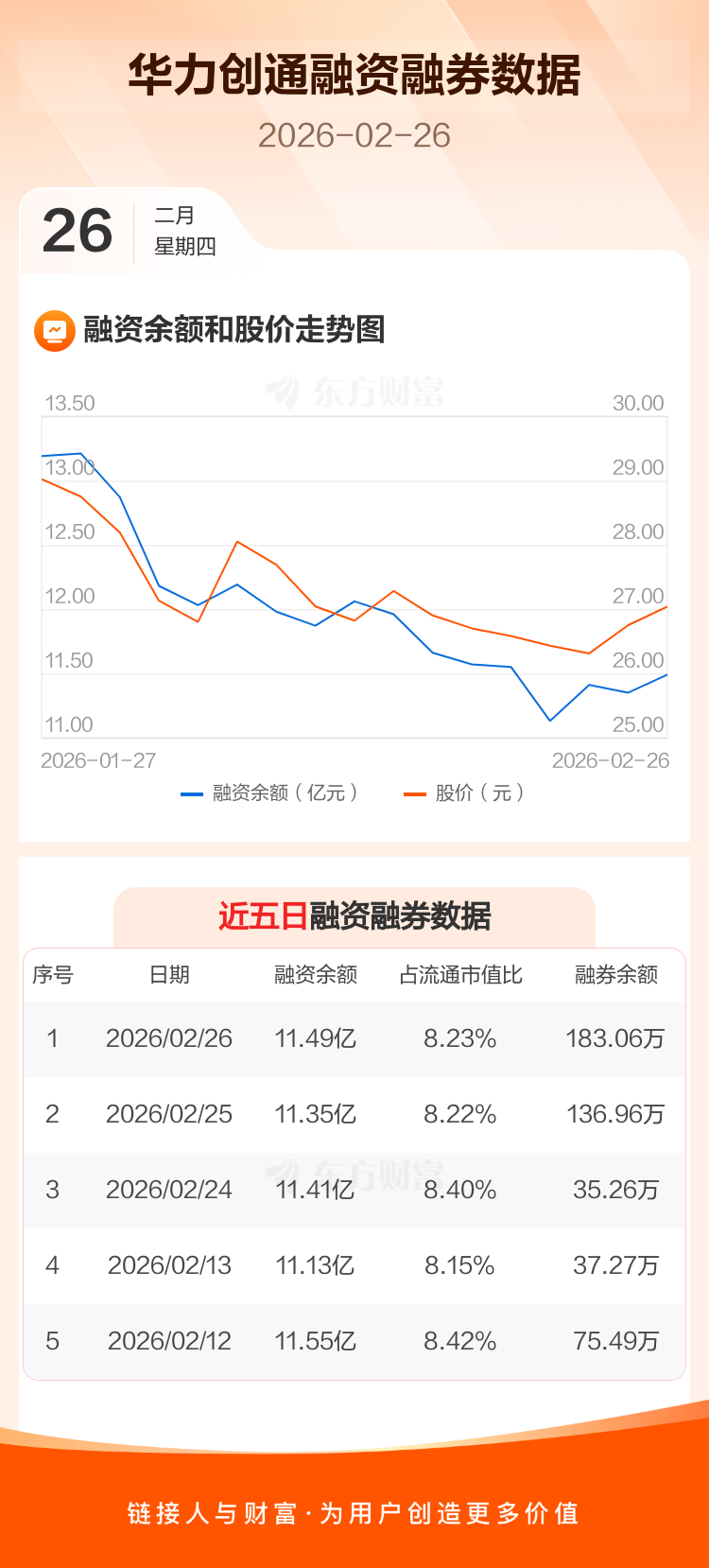 交易所最新数据显示,华力创通于2026年2月26日获融资买入6948.56万元,融资偿还5560.72万元,当日融资净买入1387.83万元。目前,该股融资余额11.49亿,占流通市值比例为8.23%。
