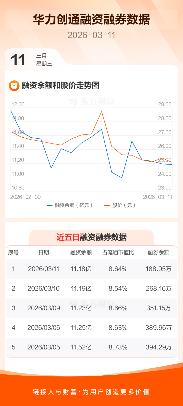 交易所最新数据显示,华力创通于2026年3月11日获融资买入3805.66万元,融资偿还3912.11万元,当日融资净偿还106.45万元。目前,该股融资余额11.18亿,占流通市值比例为8.64%。