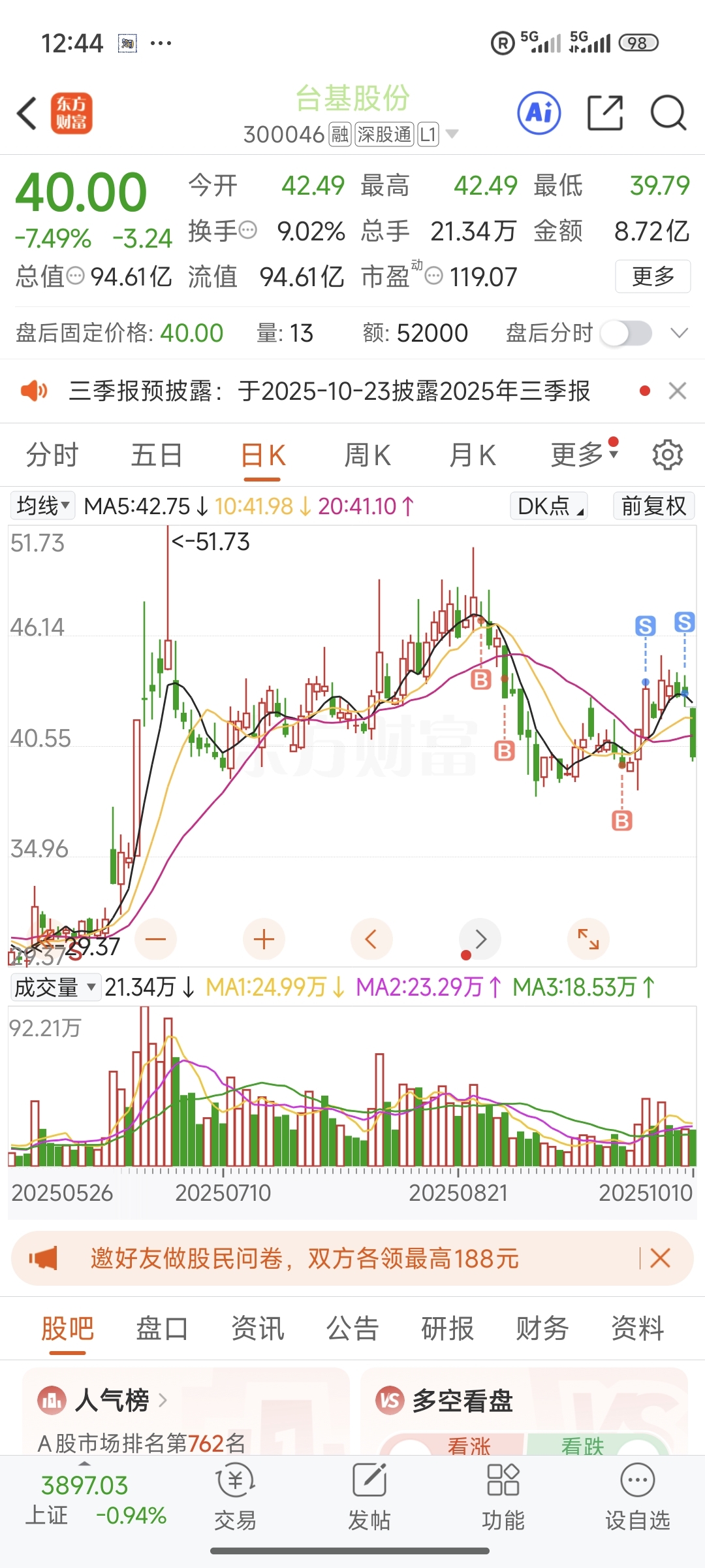$台基股份(SZ300046)$ 还好昨天跑了,小赚几千