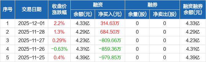 台基股份:融资净买入314.63万元,融资余额4.33亿元(12-01)