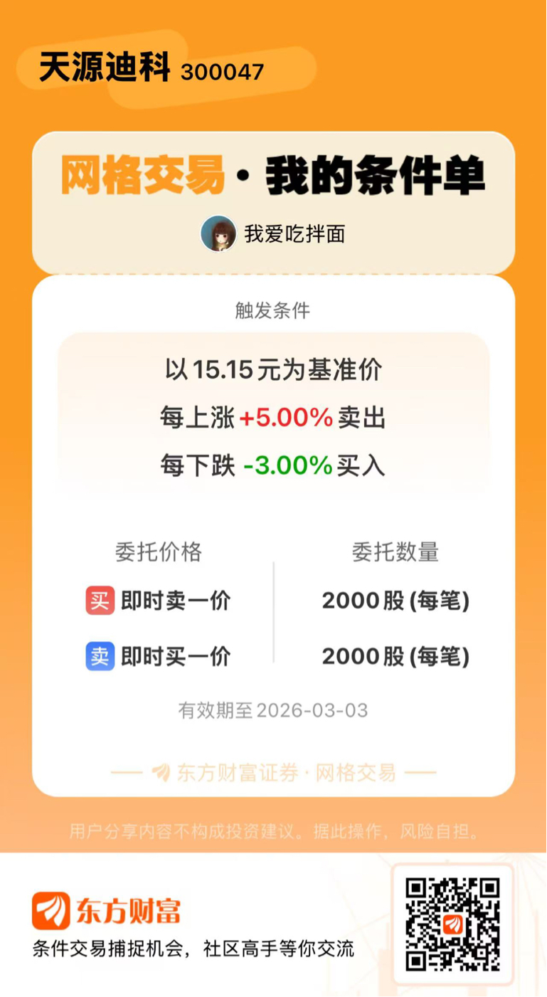 $天源迪科(SZ300047)$ 笛子财富密码,每日网格自动交易一次