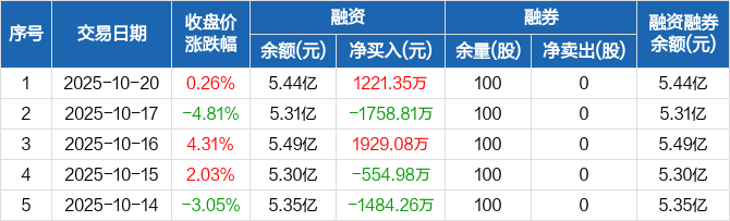 融资方面,当日融资买入3312.58万元,融资偿还2091.23万元,融资净买入1221.35万元。融券方面,融券卖出0股,融券偿还0股,融券余量100股,融券余额1548元。融资融券余额合计5.44亿元。