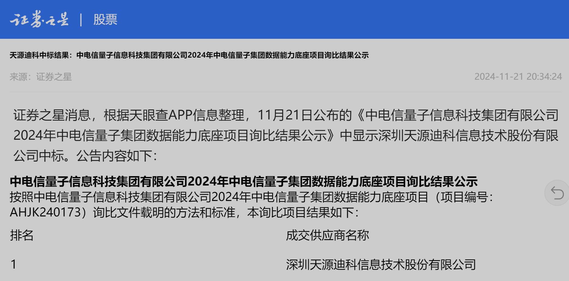 2024年11月21日证券之星--天源迪科中标结果:中电信量子信息科技集团有限公