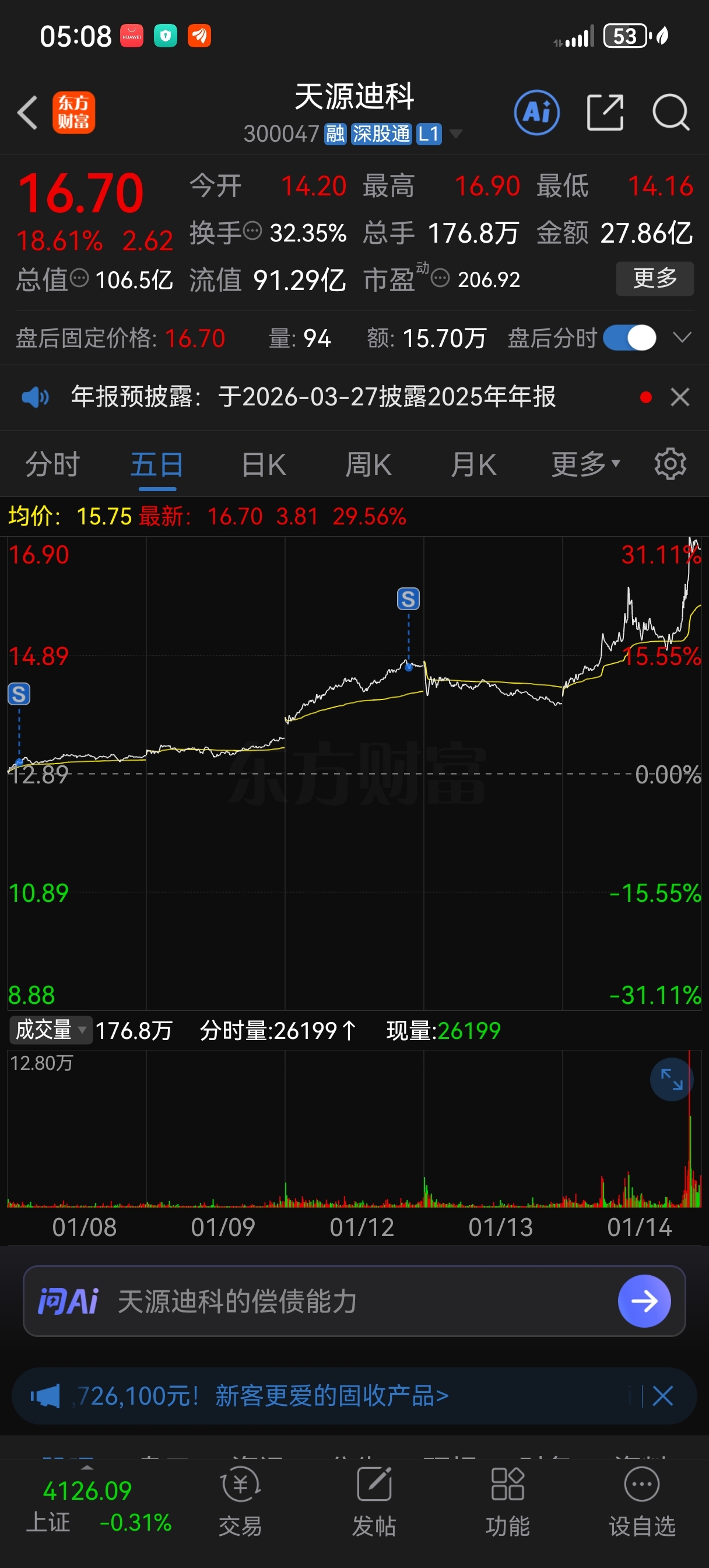 $天源迪科(SZ300047)$ 拿了两个多月结果卖飞