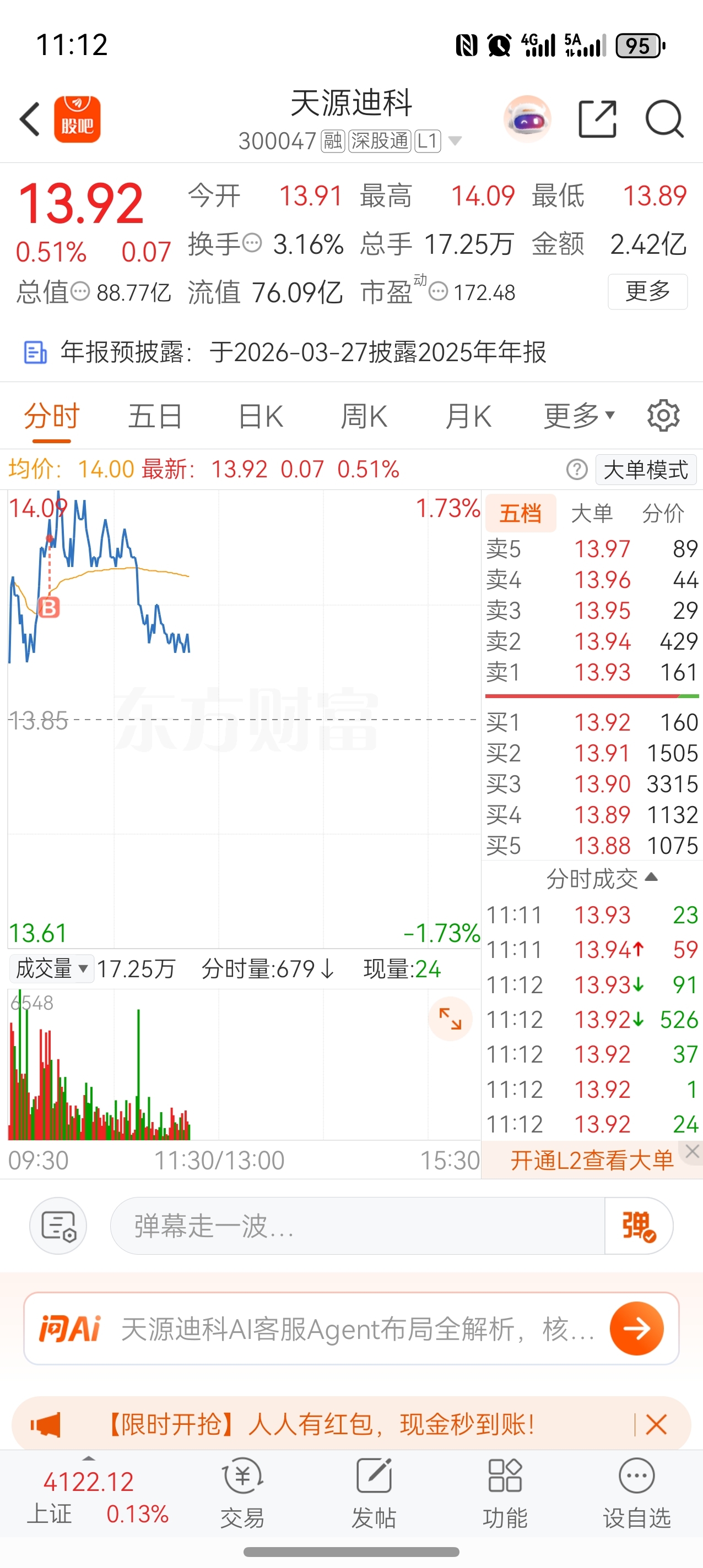 $天源迪科(SZ300047)$ 没得玩,又是挂山顶。。。。。