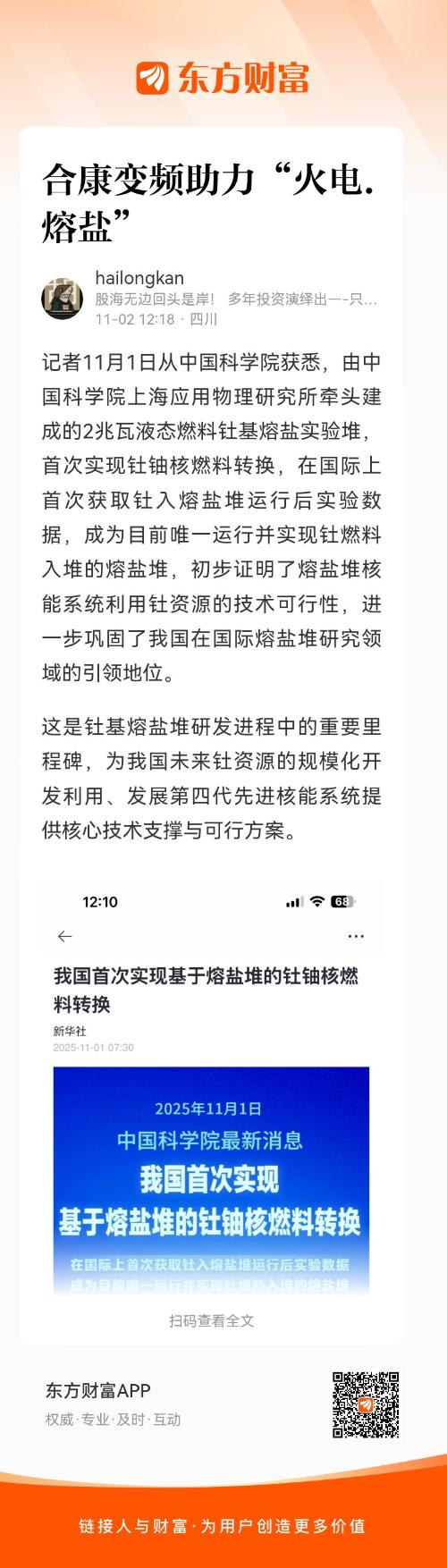 这是钍基熔盐堆研发进程中的重要里程碑,为我国未来钍资源的规模化开发利用、发展第四代先进核能系统提供核心技术支撑与可行方案。