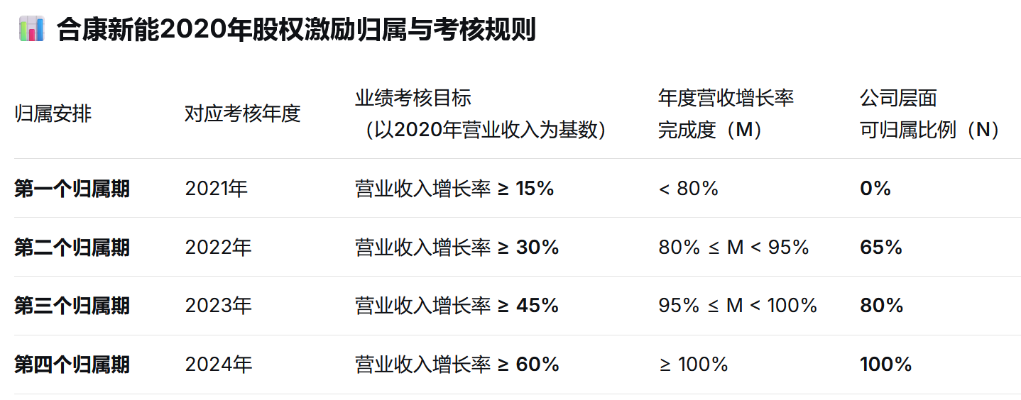 控股后不久,合康新能2020年推出限制性股票激励计划,考核指标设定为营收相关目标,不包含利润或毛利率要求。这一设计在A股上市公司股权激励中属于较为少见的类型。