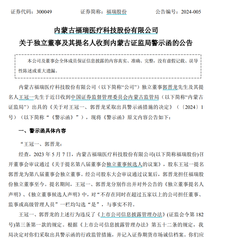 上一次是2024年2月。彼时因在提名独立董事过程中,申报文件中虚假陈述“未在超过五家公司担任董监高”,与事实不符,违反信息披露相关规定,王冠一被内蒙古证监局出具警示函并记入诚信档案。