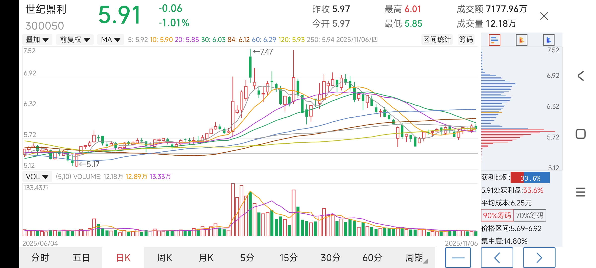 $世纪鼎利(SZ300050)$ 上面的筹码居高不下!还得洗盘回落了!