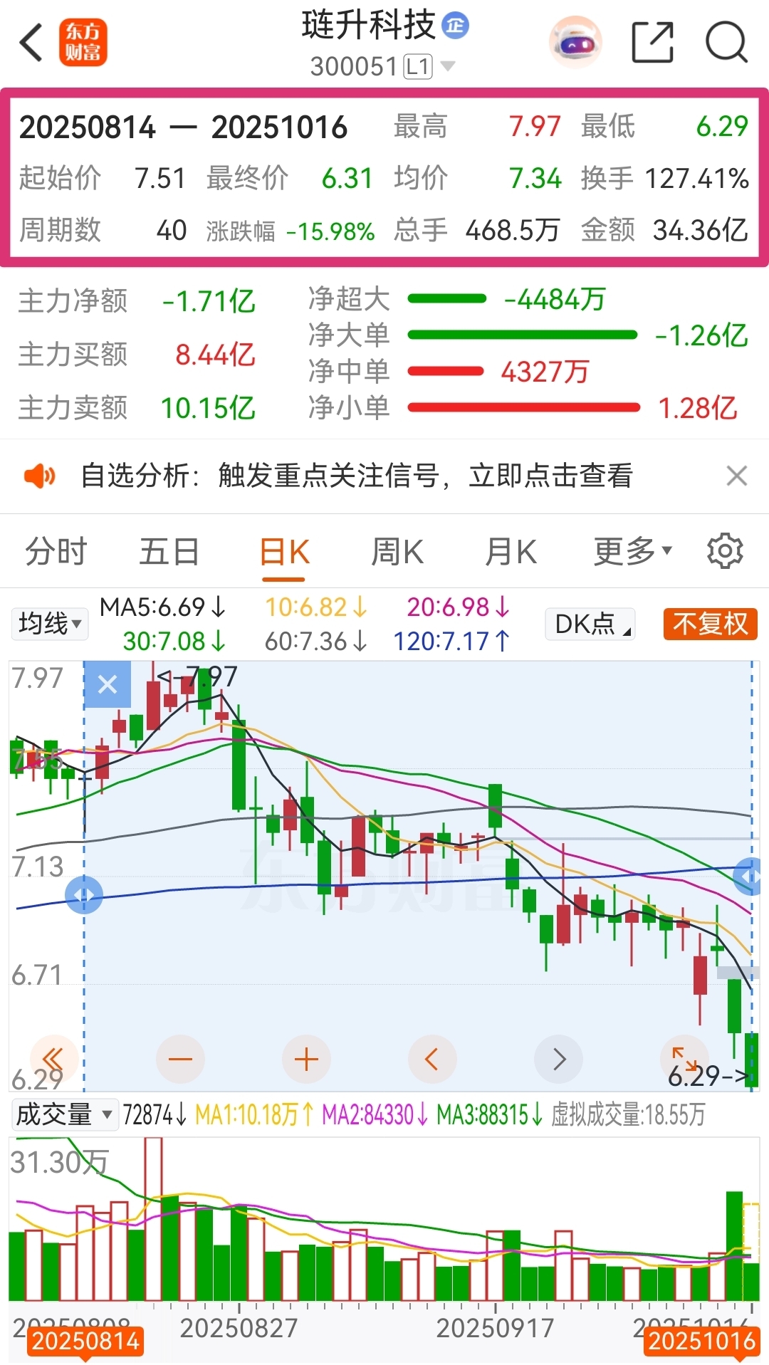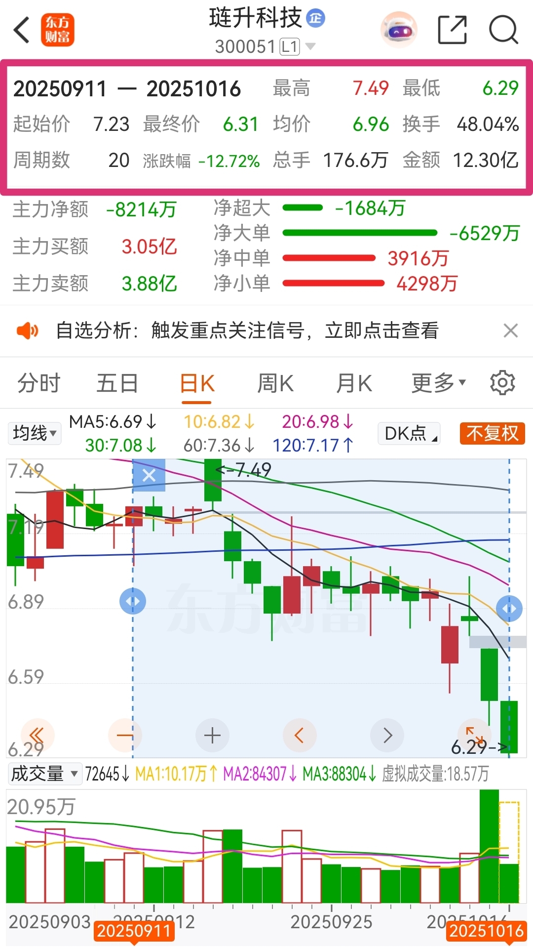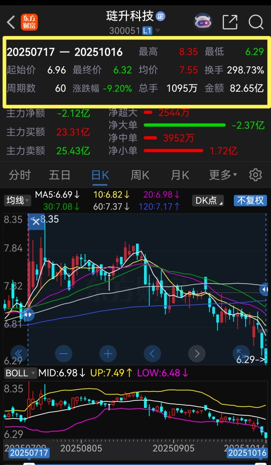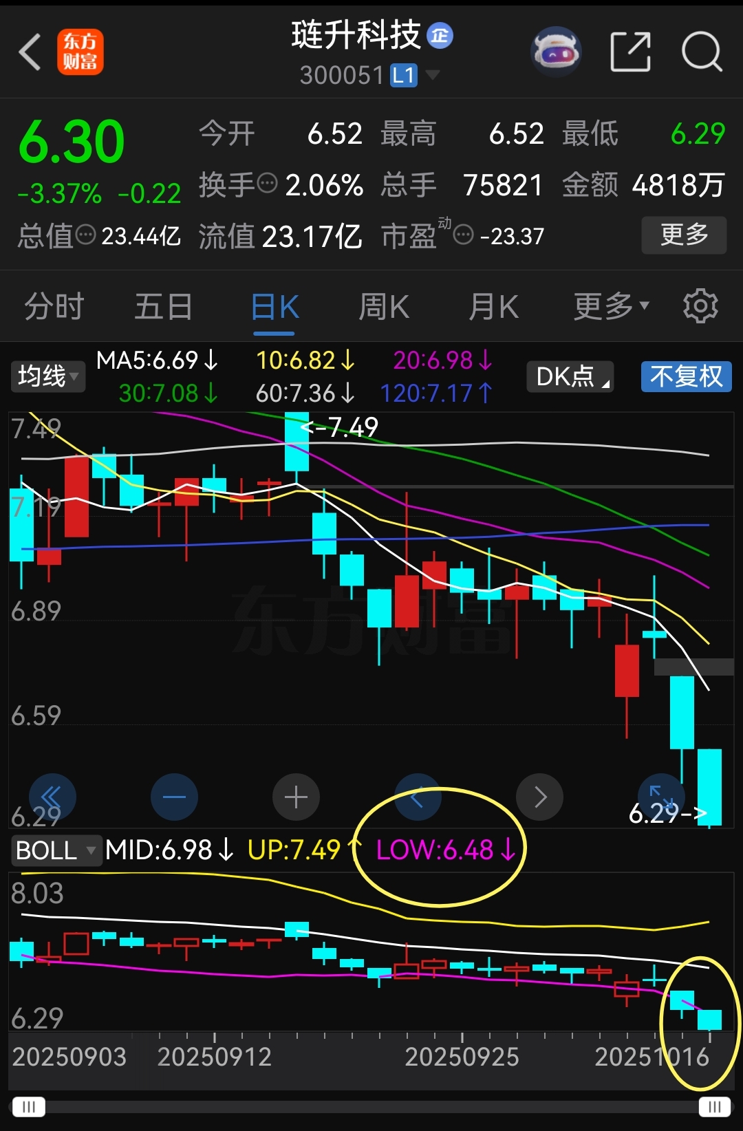 日K线图中线指标BOLL线下轨的价格为6.48元!沪深两市的金典,击穿下轨必击发强力反攻!