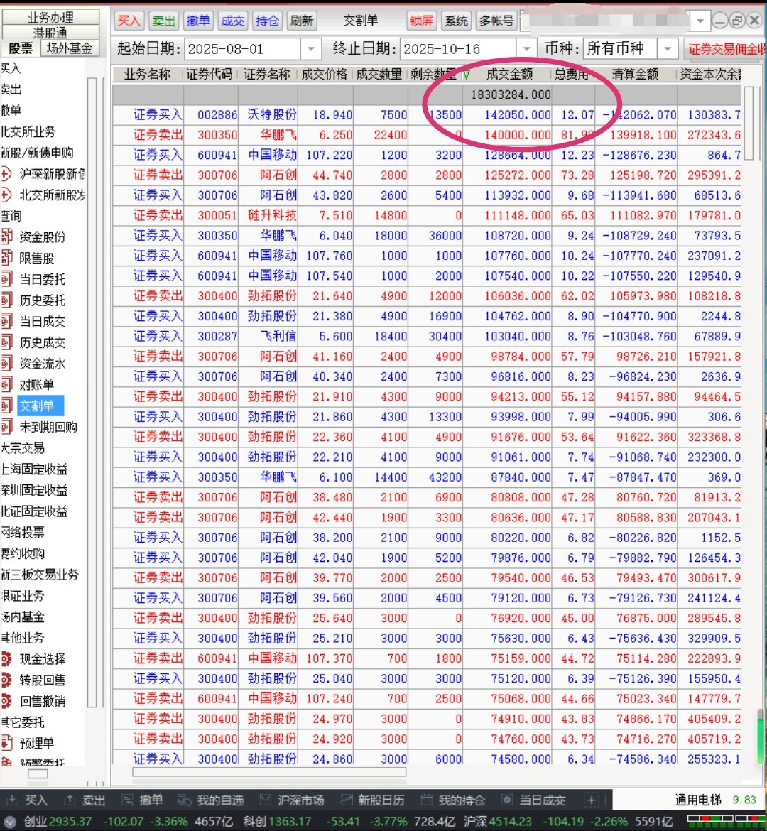 在电脑上汇总了8月1日至10月16日,交易总金额数据共计18303284.00元,这个交易总额还不及老鲨鱼当年一个月的交易额!现在只是玩一玩而已!18303284元/2卖与买=9151642元*0.0005印花税=4575.82元(贡献的印花税),18303284元*0.000085佣金=1555.77元(贡献给券商的佣金,券商的佣金中,还包括了各种必须要上缴交易所费用),其实税务总局才是真正的收入大户!券商是表面风光而已!所以得充分理解券商的不易!