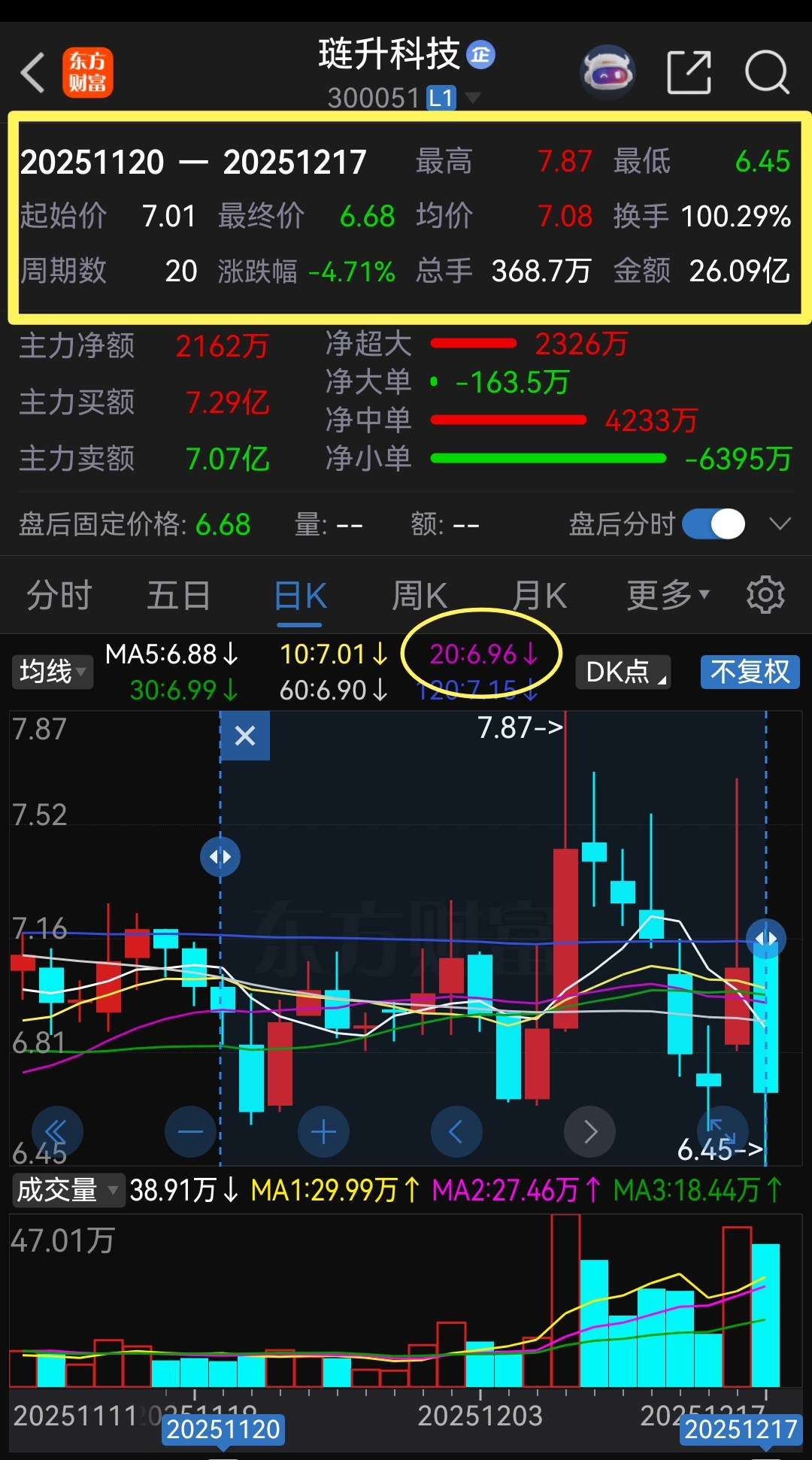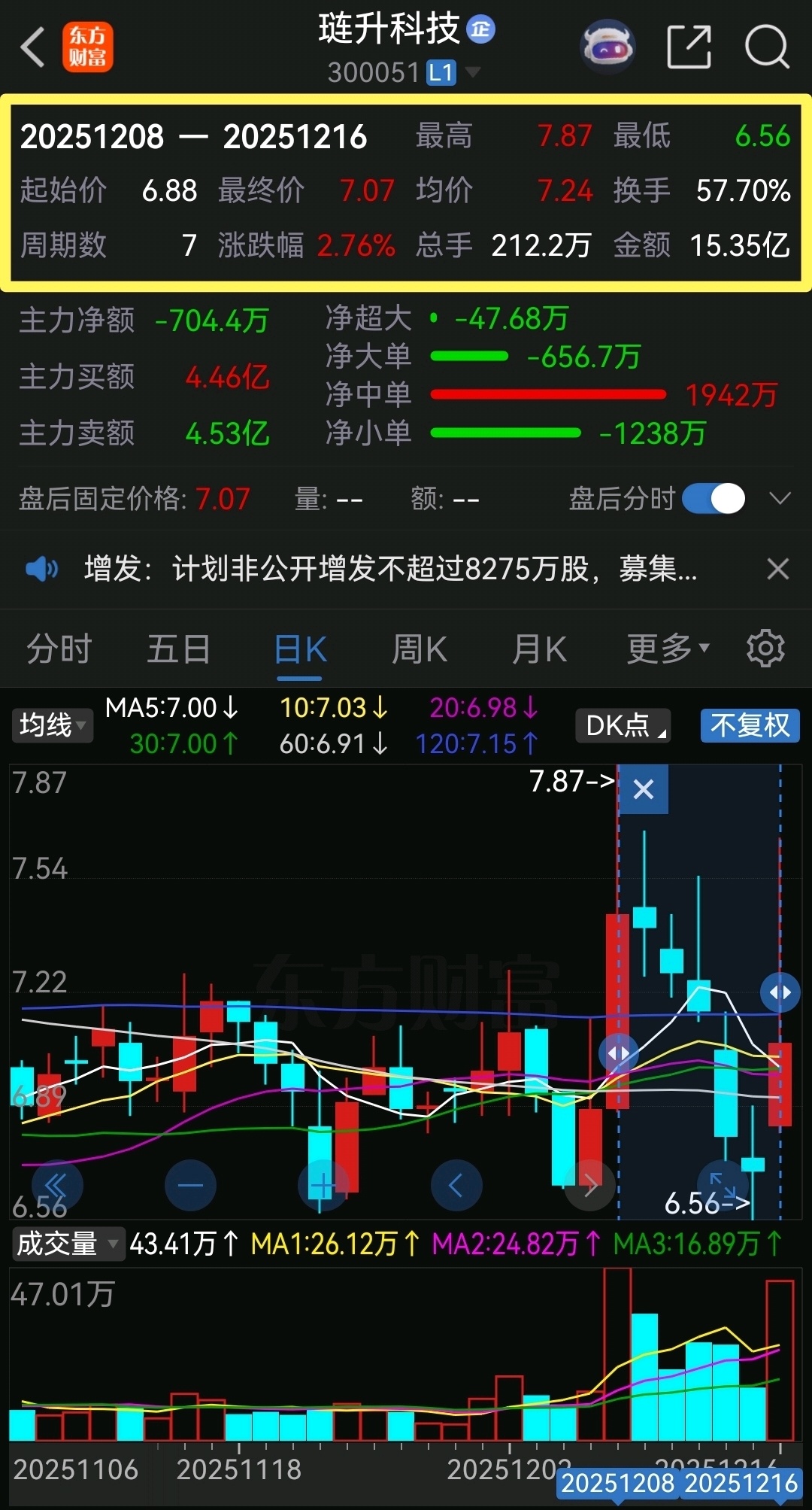 股友们必须要弄懂!上面截图黄框中的数据分开多看几次就会慢慢弄明白!20251208--20251216 (交易日的时间日子)这期间最高 7.87元 最低 6.56元,起始价 6.88 元,最终价7.07元,7个交易日的成交均价 7.24 换手 57.70% (7天的换手率,【总股本为100%】),周期数 7天,7天的涨跌幅 2.76% 7天总成交手 212.2万 ,7天总成交金额 15.35亿,【大约总成交金额15.35亿元/2.122亿大约总股数=7.233742(约7.24元/7天平均成交价)】