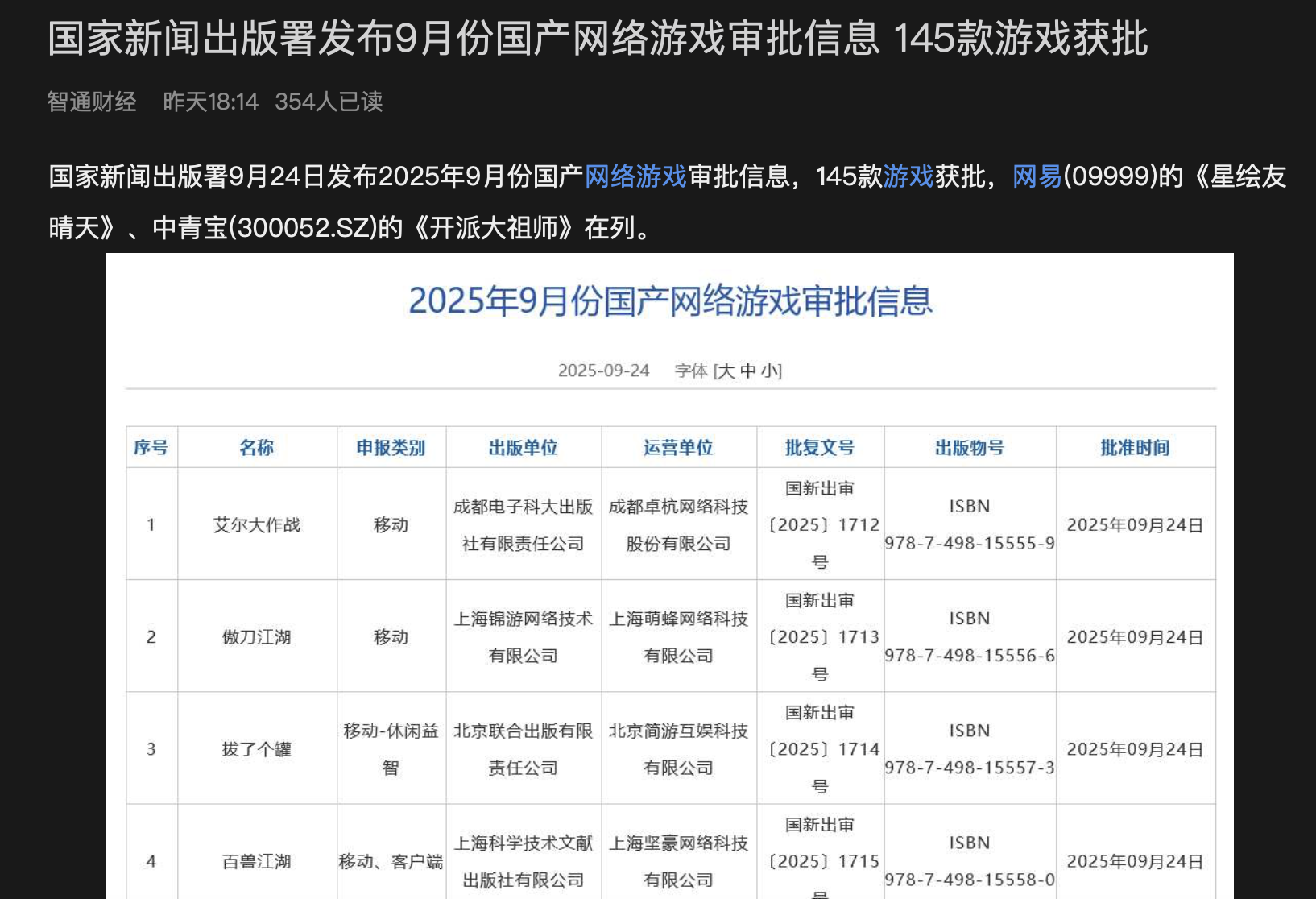 国家新闻出版署9月24日发布2025年9月份国产网络游戏审批信息,145款游戏获