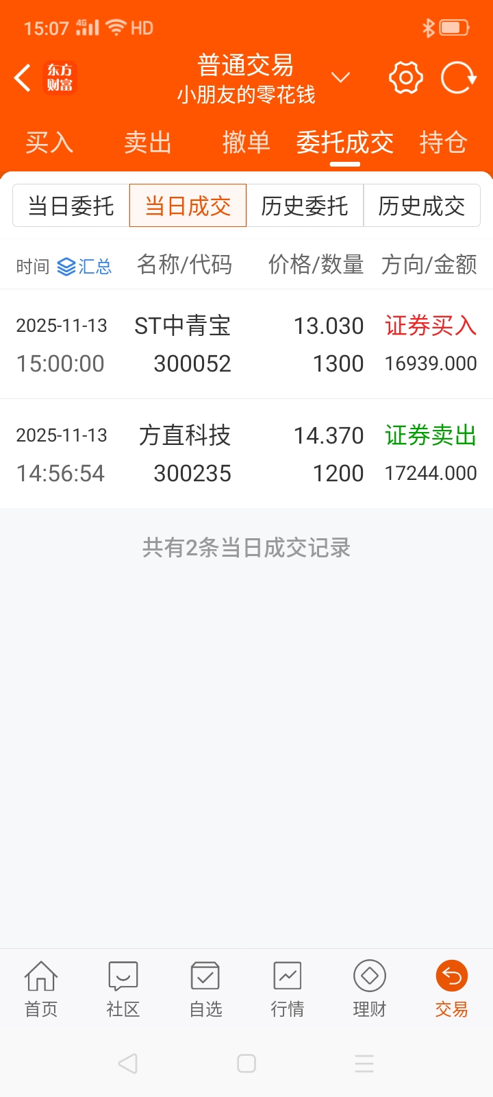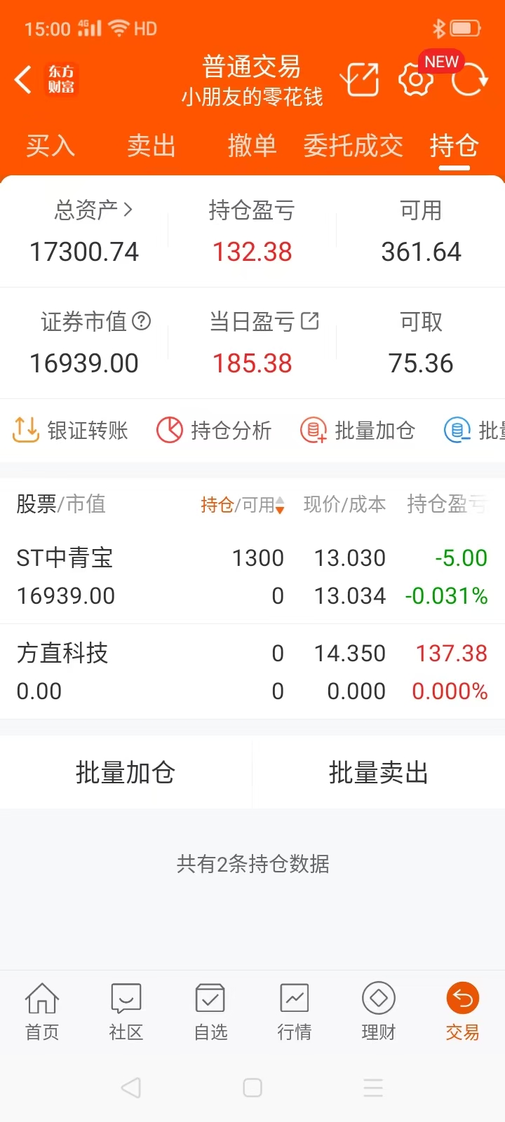 尾盘2:46分卖出方直科技, 集合竞价挂高一分买入 ST中青宝。