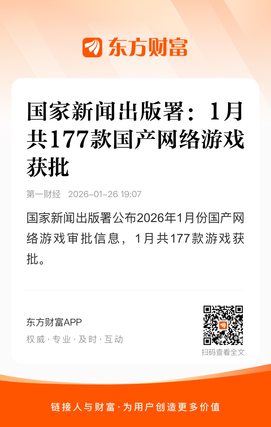 国家新闻出版署公布2026年1月份国产网络游戏审批信息,1月共177款游戏获批。