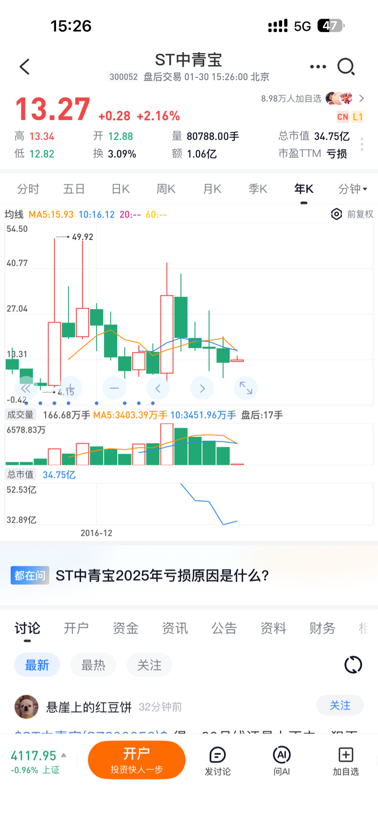 $ST中青宝(SZ300052)$ 宝哥这五年业绩一如既往的稳定,而股价却因为st错失此波大行情,处于近五年底部!!!2月份崭新摘帽行情,看好宝哥,就凭他的名字-中青宝,当年赫赫有名的大牛股。摘帽后回归主板就凭刷脸都值一个20厘米,腾飞吧宝哥!!!