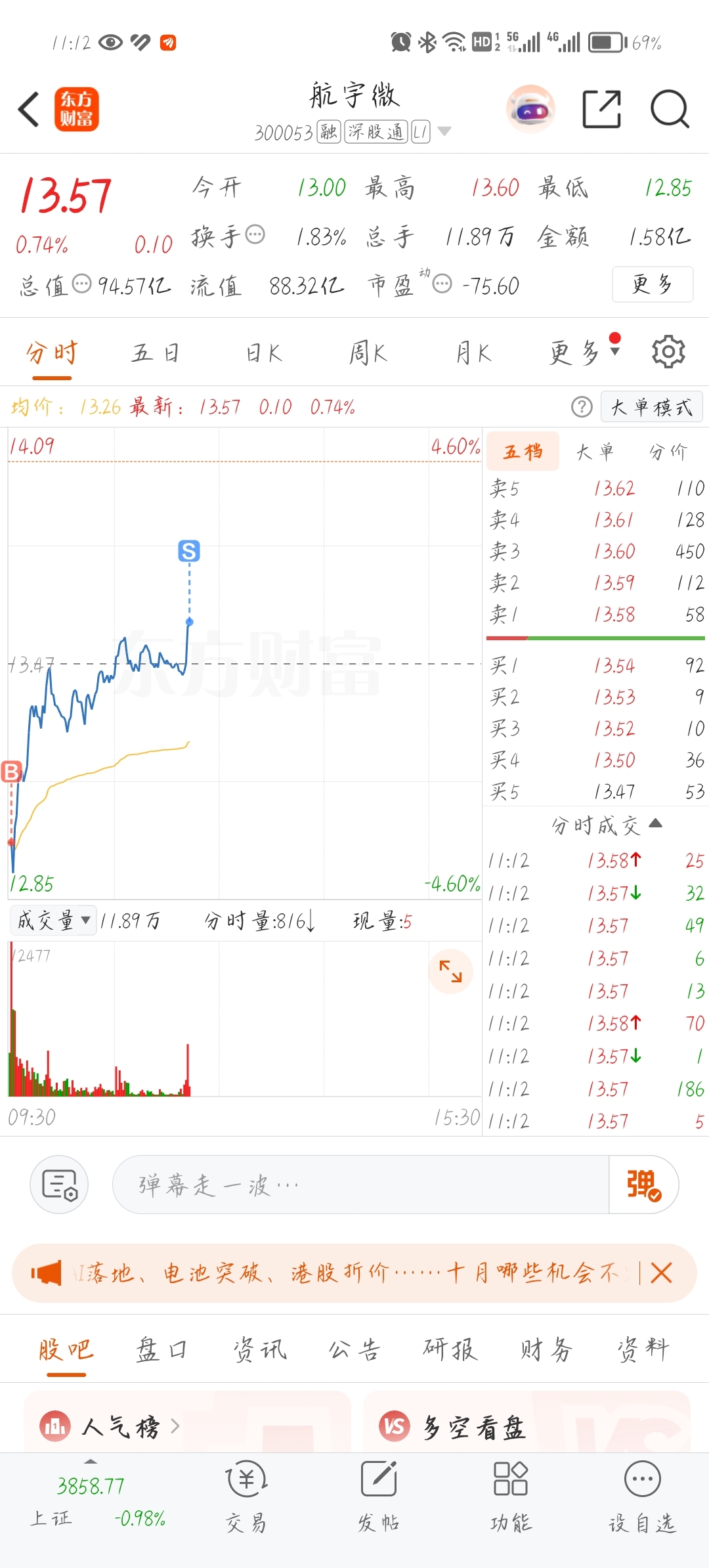 $航宇微(SZ300053)$ 大盘缩量,不好现象,走人!