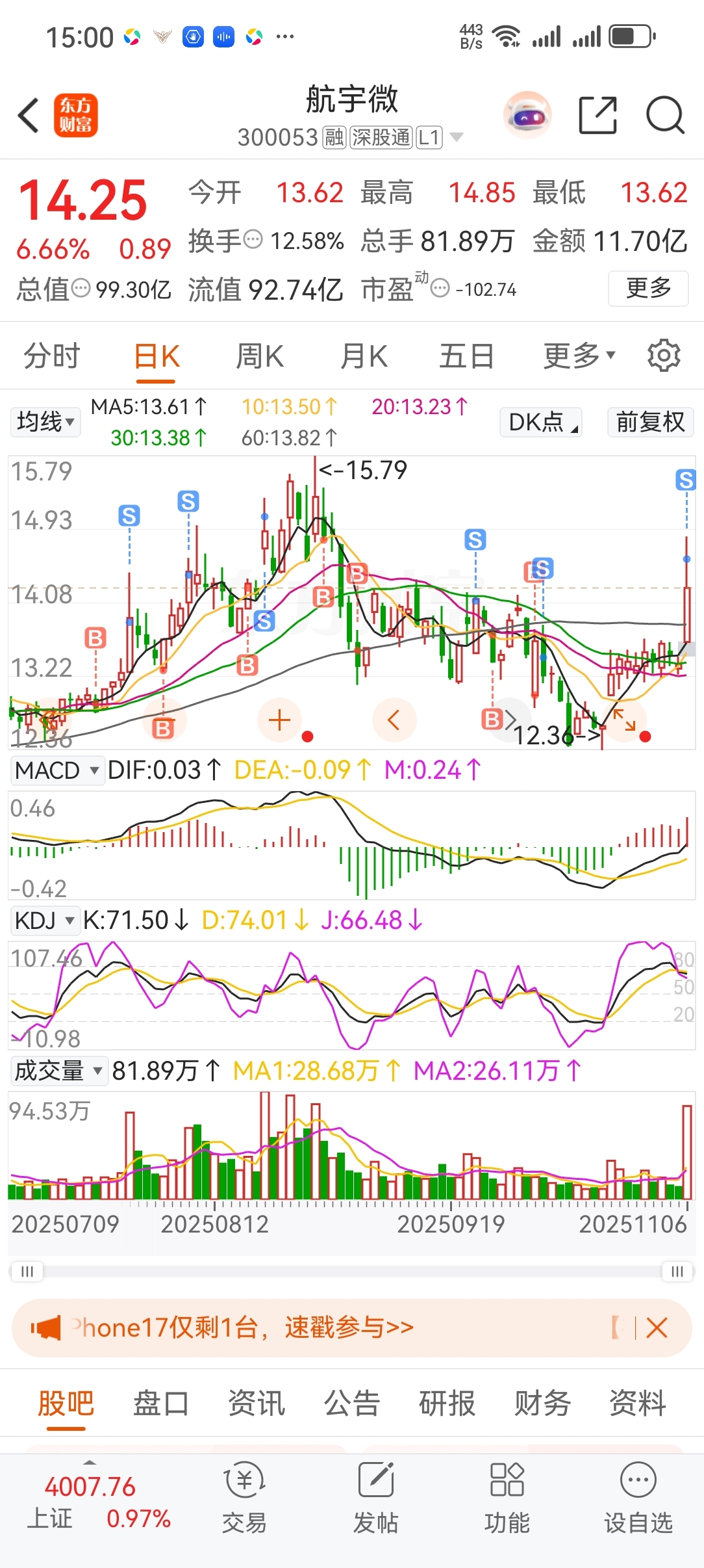 $航宇微(SZ300053)$ 二十厘米的当天涨10个点以上不跑,明天就给你洗干榨尽,然后你只得拿一两个月陪它颠簸。希望我大嘴巴说反。