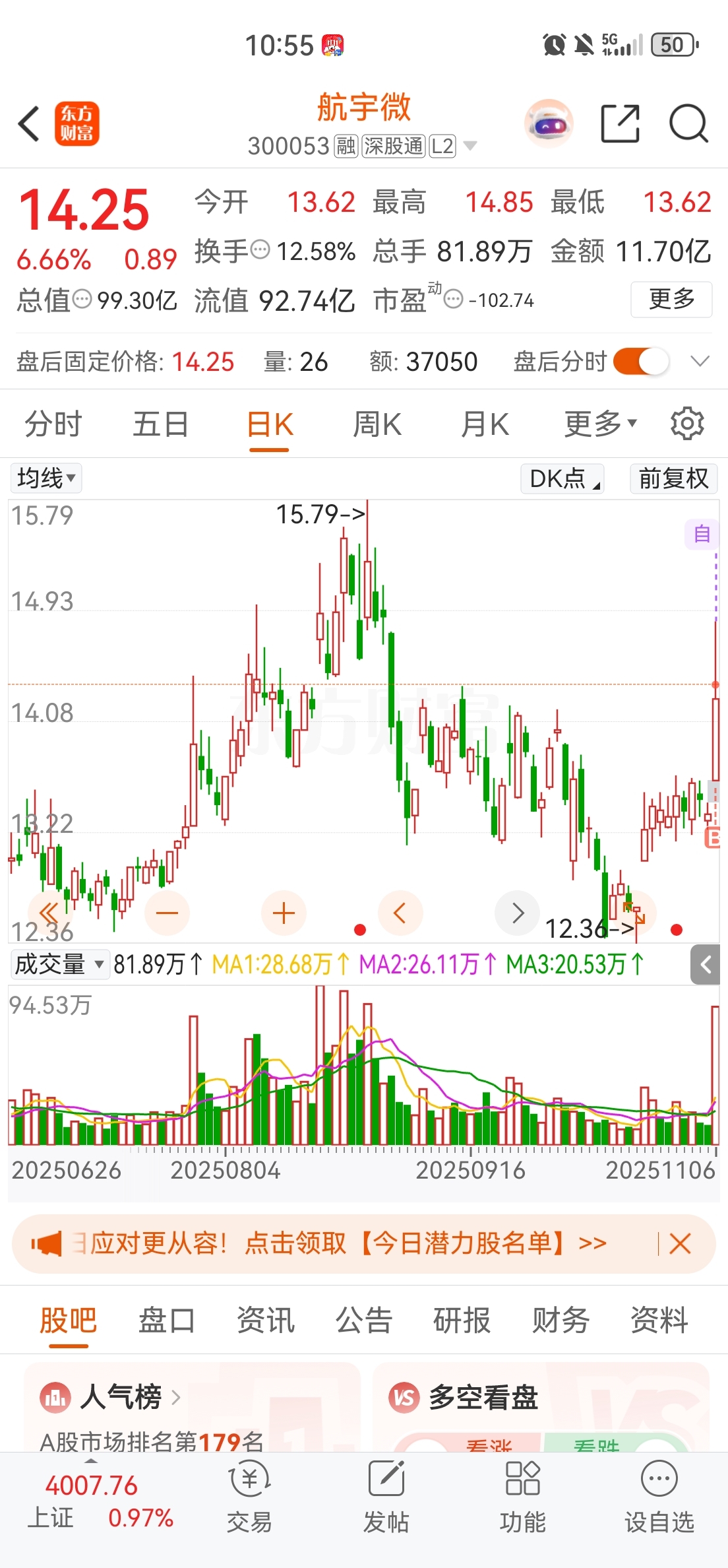 $航宇微(SZ300053)$ 去年进吃面,今天再次进了,删掉软件月底再看