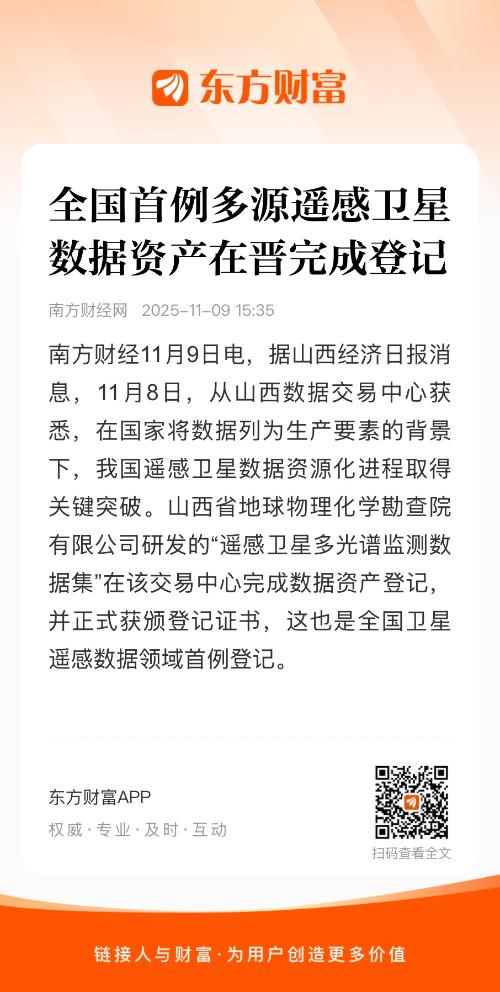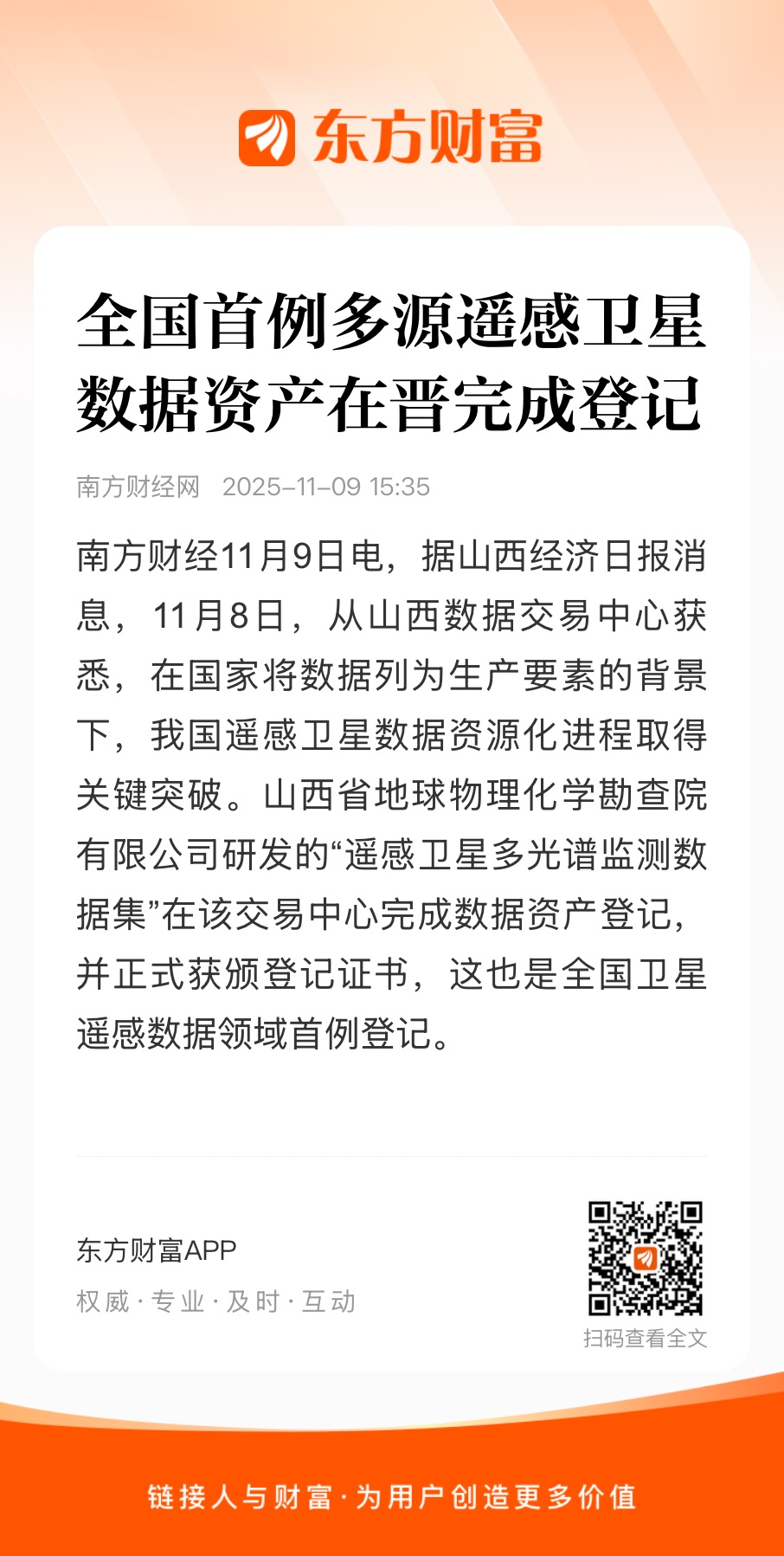南方财经11月9日电,据山西经济日报消息,11月8日,从山西数据交易中心获悉,在国家将数据列为生产要素的背景下,我国遥感卫星数据资源化进程取得关键突破。山西省地球物理化学勘查院有限公司研发的“遥感卫星多光谱监测数据集”在该交易中心完成数据资产登记,并正式获颁登记证书,这也是全国卫星遥感数据领域首例登记。