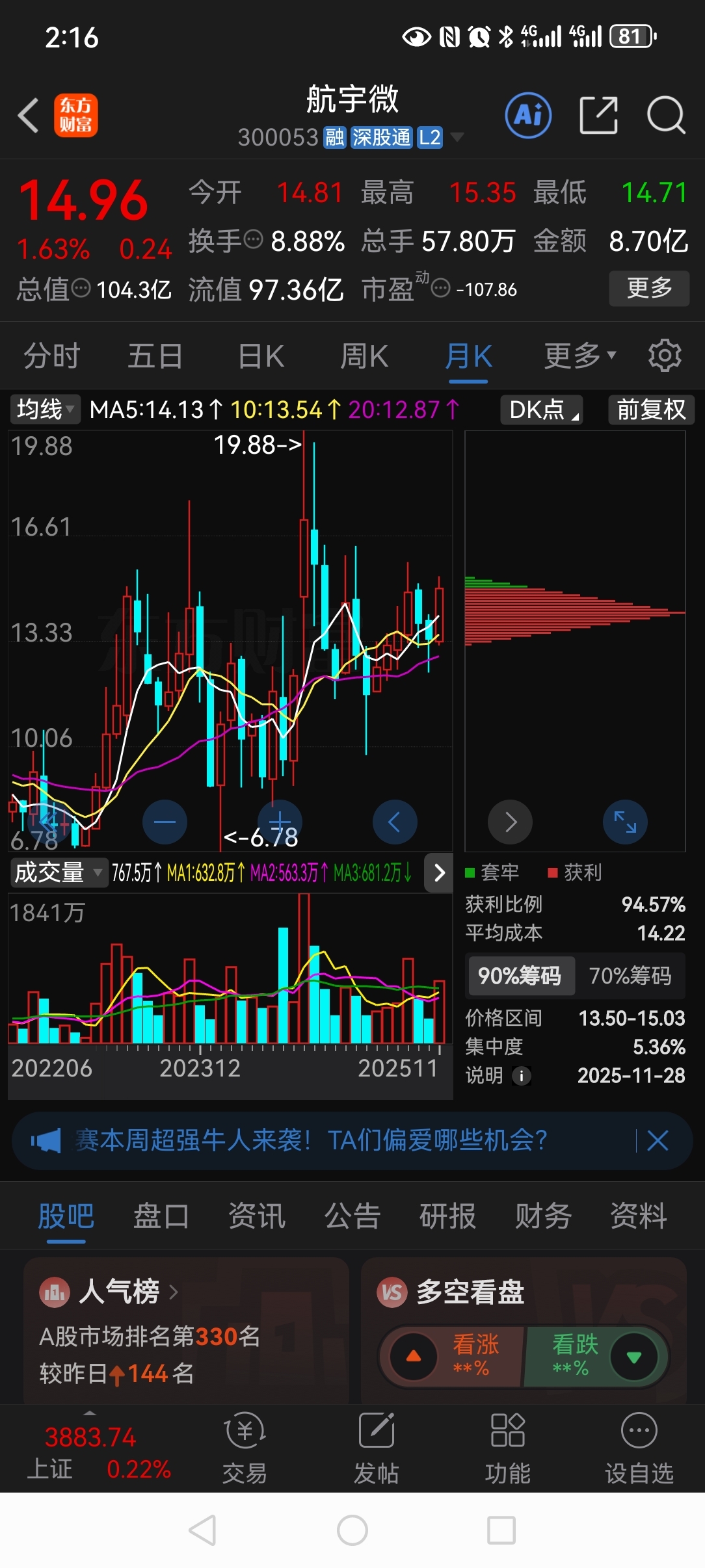 $航宇微(SZ300053)$ 航宇微收盘站稳14.85以上,就已经是一年以来月线收盘最高价,12月应有新高!