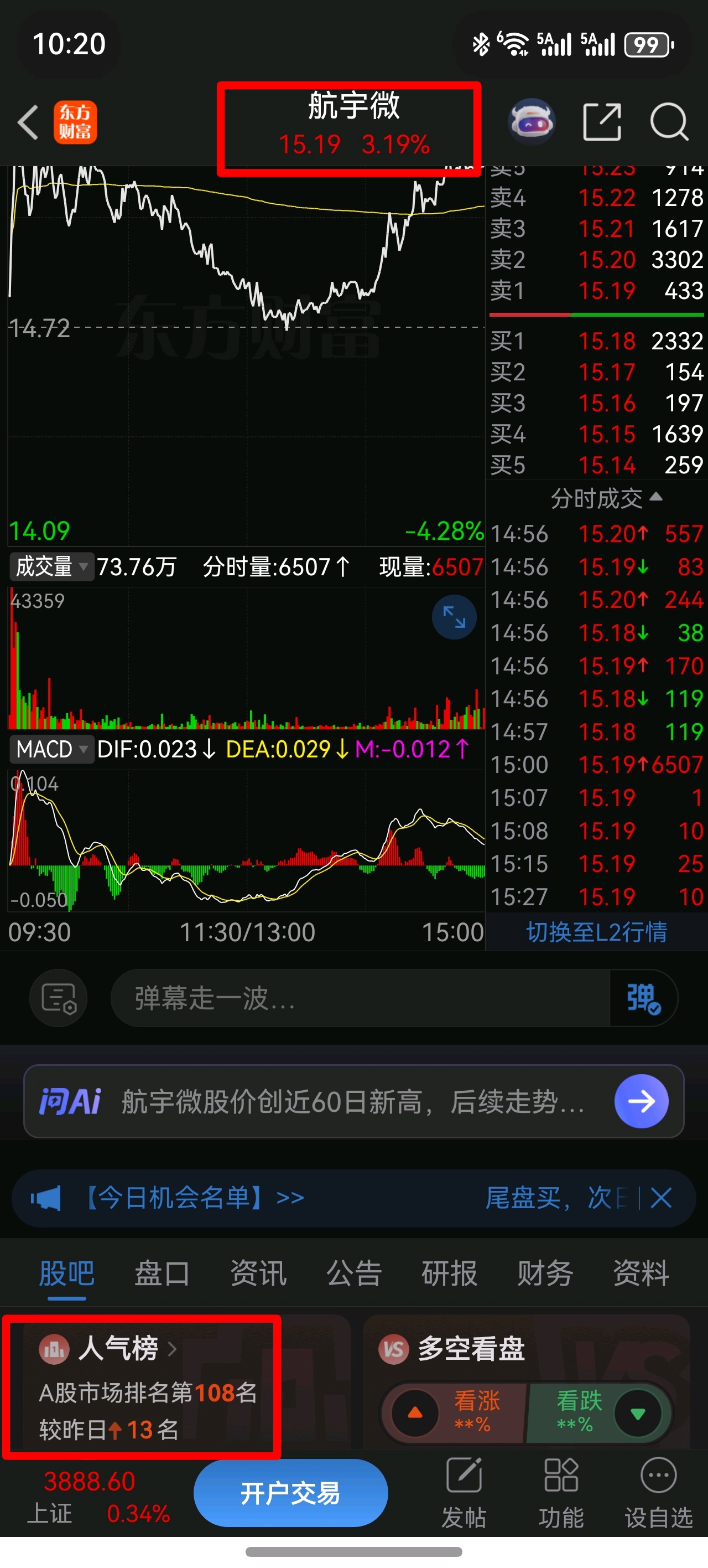 $航宇微(SZ300053)$ 航宇微这人气排名相当诡异,对比同属创业板、同属商业航天概念、市值也都差不多、但周五涨幅更大的新雷能,航宇微人气接近100名,而新雷能还在200名开外!你细品……