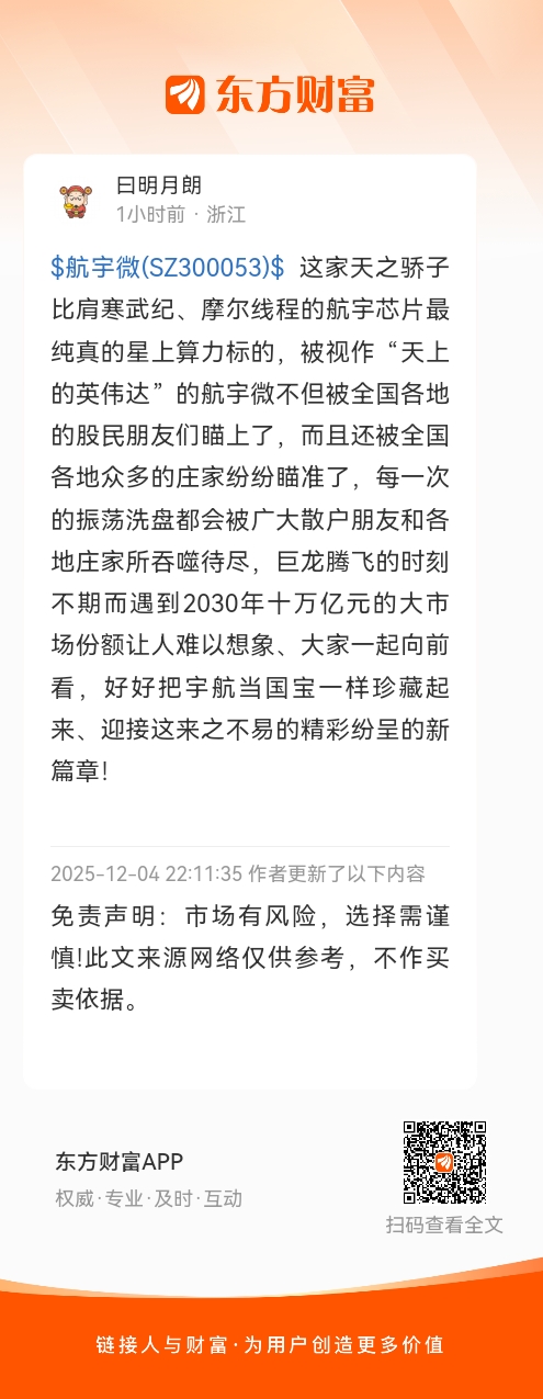 $航宇微(SZ300053)$ 这家天之骄子比肩寒武纪、摩尔线程的航宇芯片最纯真的星上算力标的,被视作“天上的英伟达”的航宇微不但被全国各地的股民朋友们瞄上了,而且还被全国各地众多的庄家纷纷瞄准了,每一次的振荡洗盘都会被广大散户朋友和各地庄家所吞噬待尽,巨龙腾飞的时刻不期而遇到2030年十万亿元的大市场份额让人难以想象、大家一起向前看,好好把宇航当国宝一样珍藏起来、迎接这来之不易的精彩纷呈的新篇章!