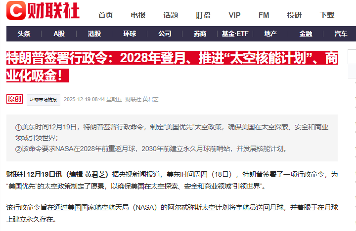 特朗普签署行政令:2028年登月、推进“太空核能计划”、商业化吸金!
