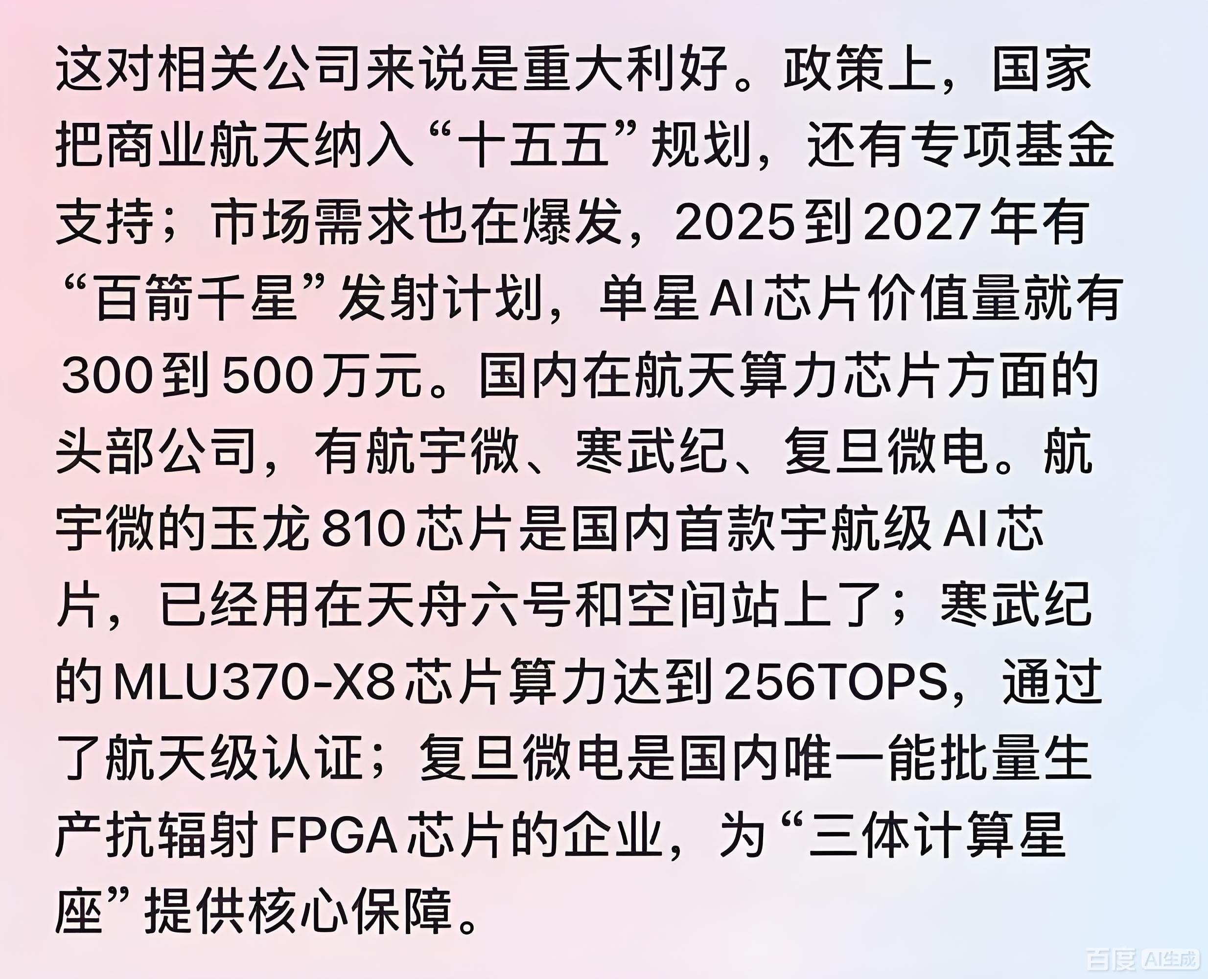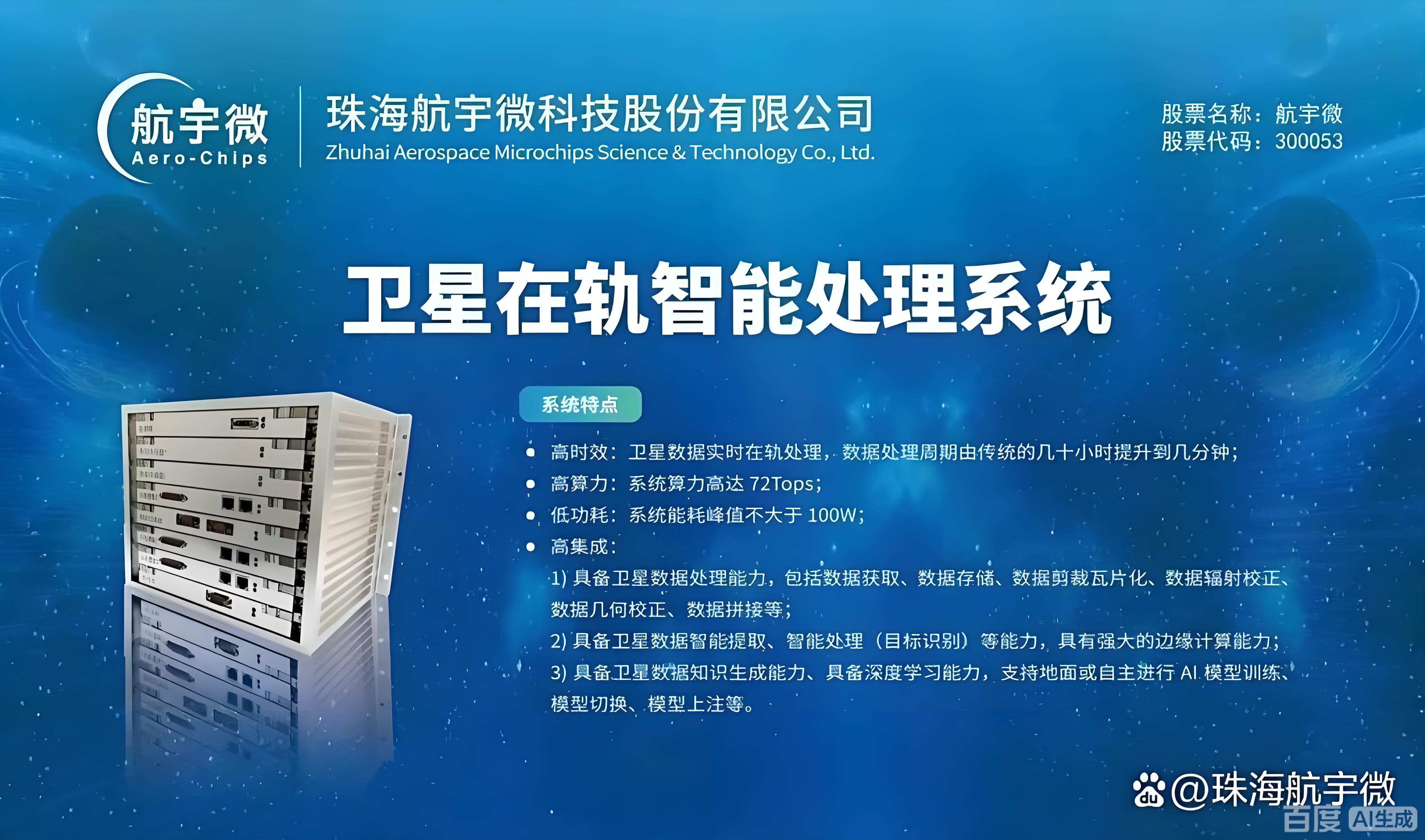 航宇微(300053)是A股唯一实现“宇航级AI芯片—卫星星座—在轨算力处理”全链条布局的商业航天企业,核心优势在于芯片自主可控、SiP立体封装与“珠海一号”星座运营,但短期盈利承压,长期受益于国产替代与商业航天爆发。 航宇微是国内商业航天领域稀缺的全链条布局标的,凭借宇航级芯片、SiP封装、卫星星座等核心资产,在国产替代与商业航天爆发背景下具备较大成长潜力。但短期需关注盈利改善、项目推进等问题。未来,随着玉龙910芯片落地、“珠海一号”星座扩容及卫星数据商业化加速,公司有望实现业绩突破。