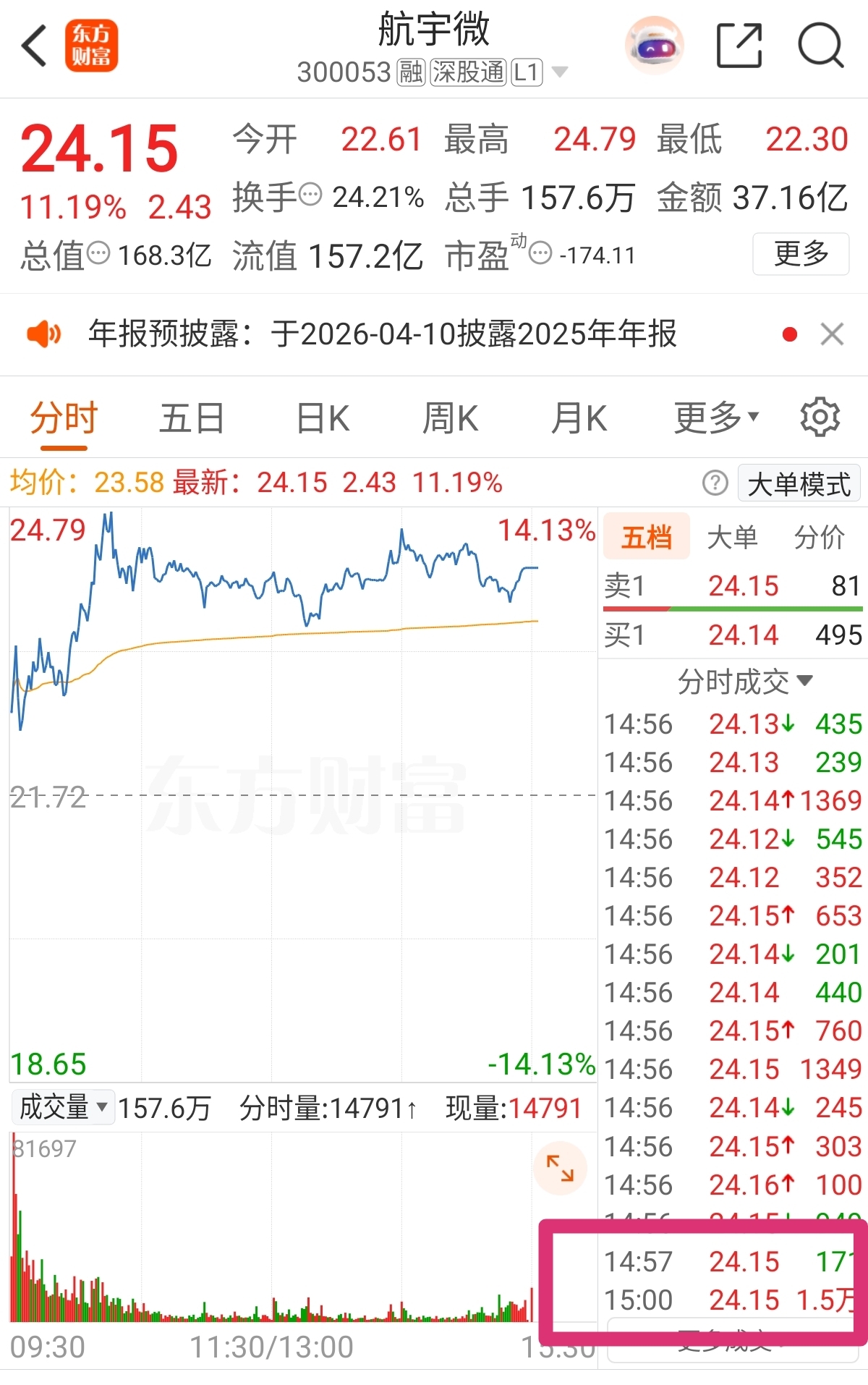 $航宇微(SZ300053)$ 尾盘这1.5万手是什么意思?