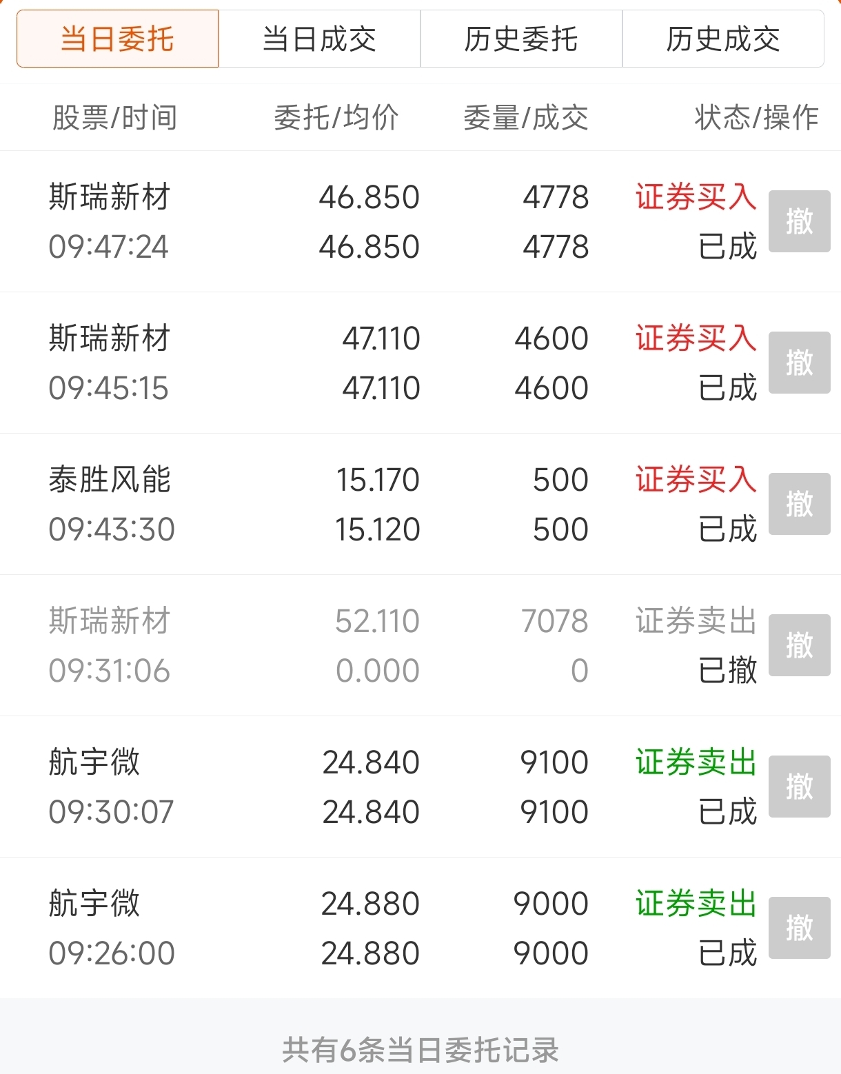 委托标的:买卖方向:笔记:开盘竞价成功抛掉航宇微,斯瑞新材误以为抛掉了,结果没成