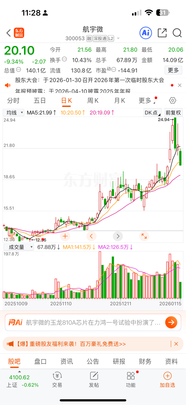 $航宇微(SZ300053)$ 最少跌到15元,可能又回10元,商业航天也就一概念,潮退一地鸡毛,一年多发一两个卫星,这么多公司分,就算一家公司分100万,对业绩有什么影响,