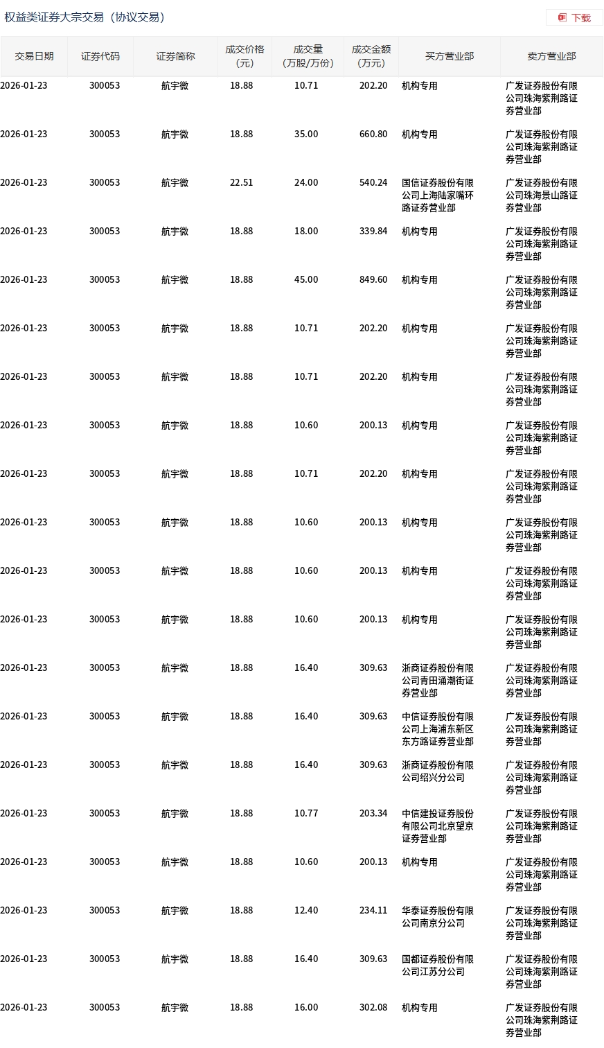 航宇微今日大宗交易成交414万股,成交额7903.42万元