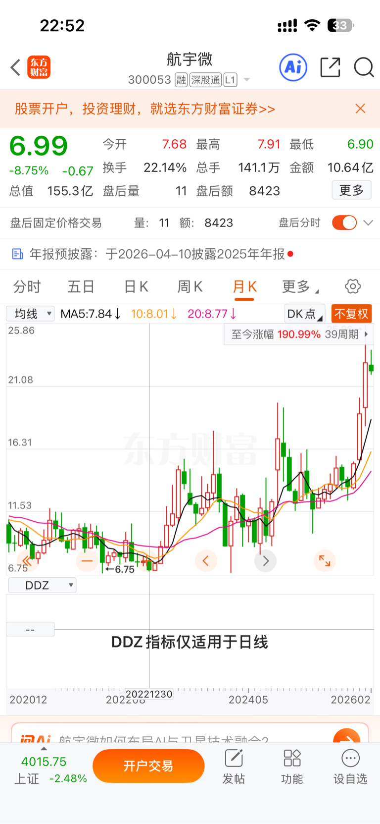 $航宇微(SZ300053)$ 历史高位已经是最大利空,明天暴跌。年尾奔盘2星期内该回到11块合理位置,苦了在山顶买入朋友