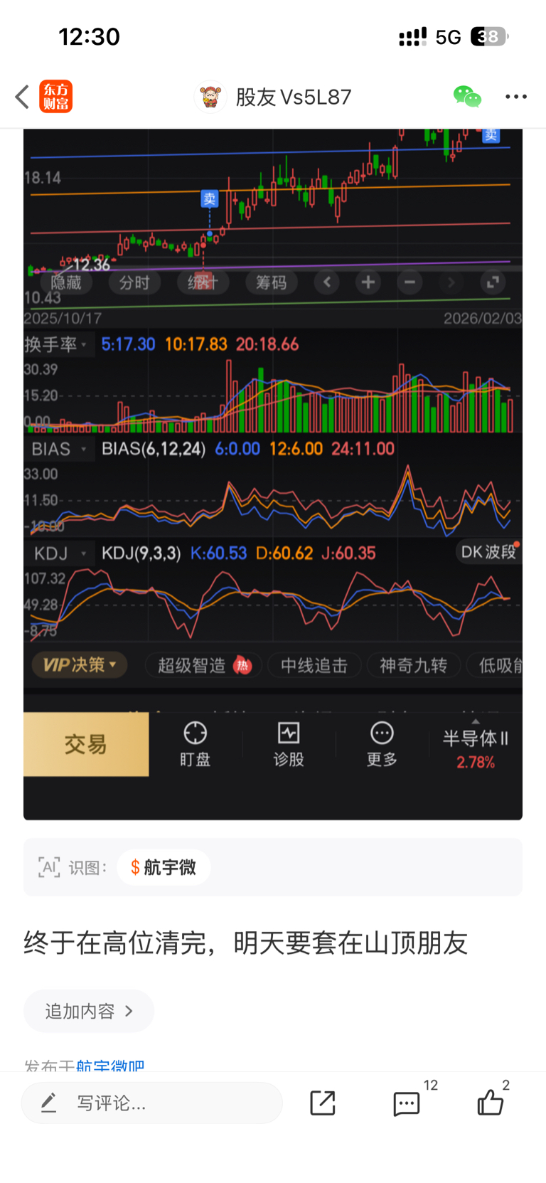 $航宇微(SZ300053)$ 昨天清完现在在看戏,已经历史高位就是最大利空,主力出货爽歪歪,因为韭菜在接盘!回调破15回到11块位置。和玛雅超级水电套路一模一样,高位出货等韭菜以为还会新高其实是在山顶。2个月后连13块都感觉是遥不可及!哪里来哪里回去