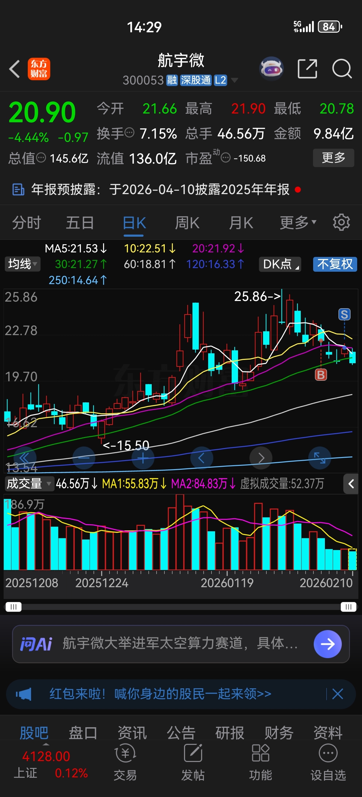 $航宇微(SZ300053)$ 亏2个点昨天割肉了,今天想尾盘买还是算了!